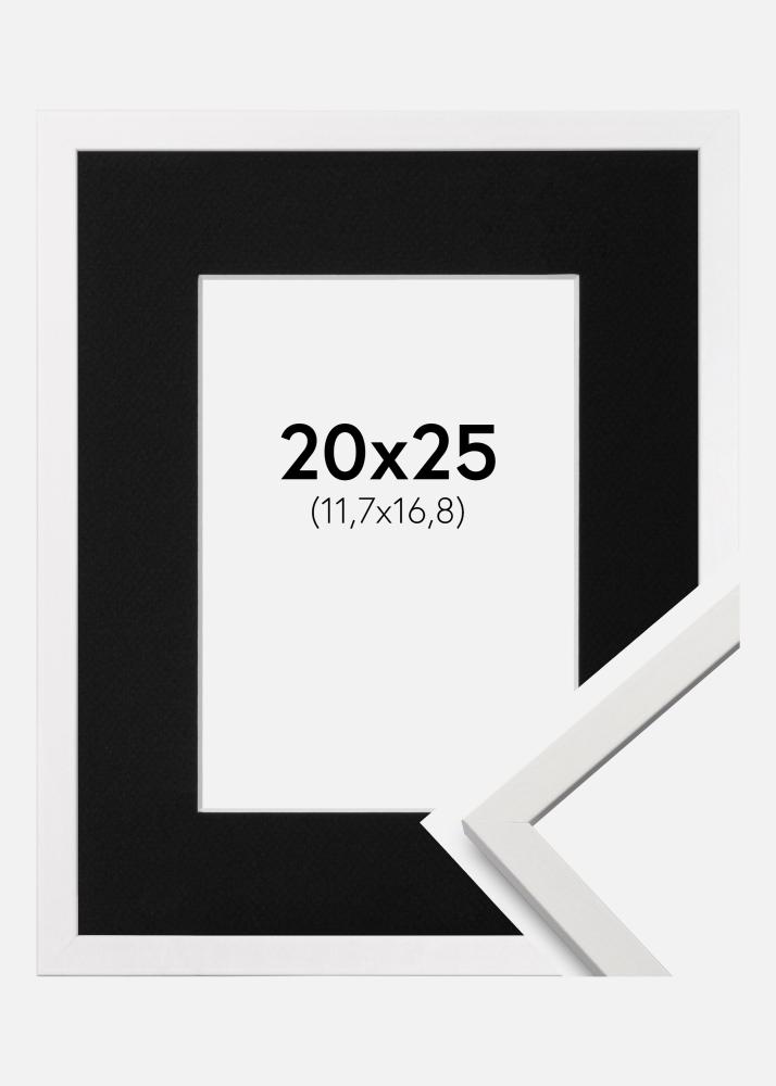Pakke med bilderamme og passende svart passepartout. På produktbildet ser du rammens mål (skrevet med fet skrift) og passepartoutens innvendige mål (skrevet i parentes). Merk at passepartoutens innvendige mål alltid må være 1 cm mindre enn ønsket bildestørrelse.