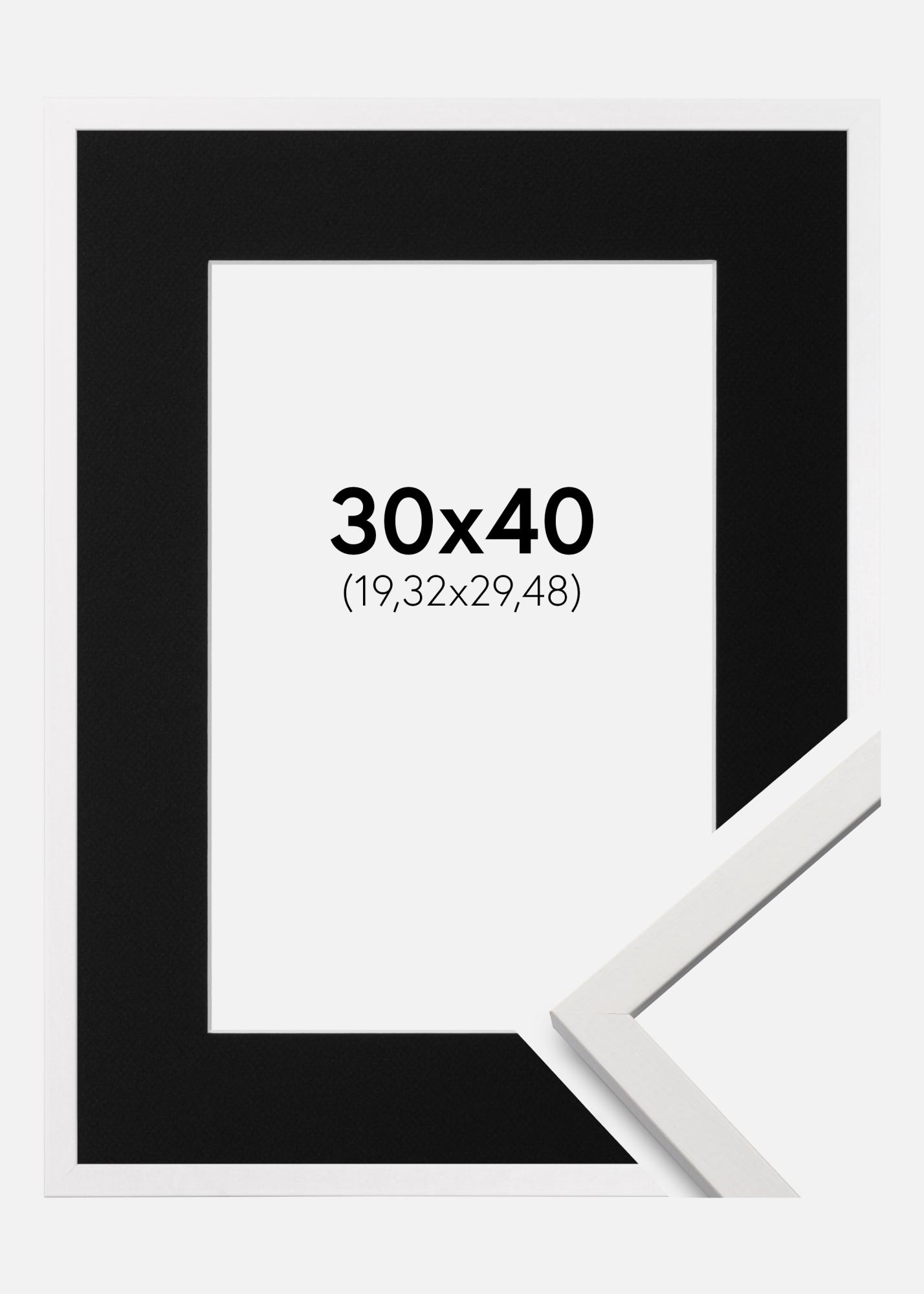 Pakke med bilderamme og passende svart passepartout. På produktbildet ser du rammens mål (skrevet med fet skrift) og passepartoutens innvendige mål (skrevet i parentes). Merk at passepartoutens innvendige mål alltid må være 1 cm mindre enn ønsket bildestørrelse.