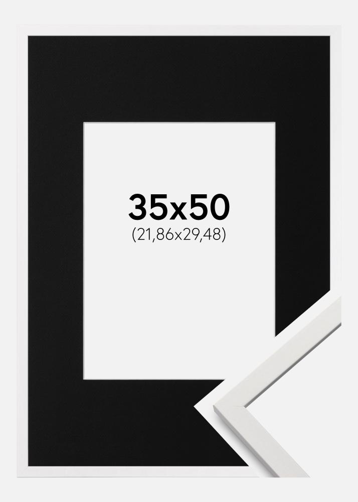 Pakke med bilderamme og passende svart passepartout. På produktbildet ser du rammens mål (skrevet med fet skrift) og passepartoutens innvendige mål (skrevet i parentes). Merk at passepartoutens innvendige mål alltid må være 1 cm mindre enn ønsket bildestørrelse.
