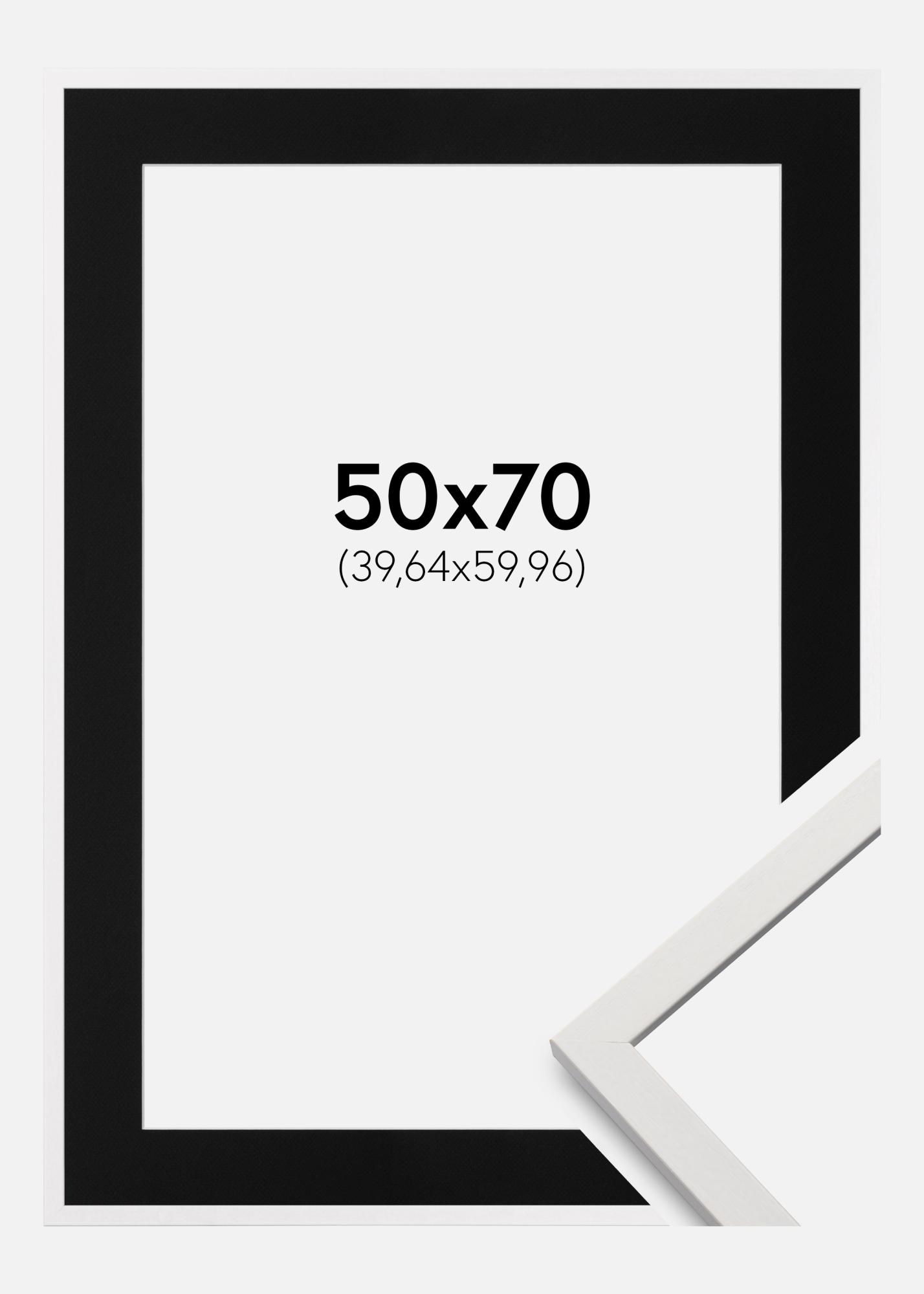 Pakke med bilderamme og passende svart passepartout. På produktbildet ser du rammens mål (skrevet med fet skrift) og passepartoutens innvendige mål (skrevet i parentes). Merk at passepartoutens innvendige mål alltid må være 1 cm mindre enn ønsket bildestørrelse.