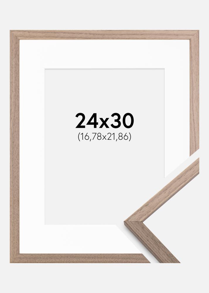 Pakke med bilderamme og passende hvit passepartout. På produktbildet ser du rammens mål (skrevet med fet skrift) og passepartoutens innvendige mål (skrevet i parentes). Merk at passepartoutens innvendige mål alltid må være 1 cm mindre enn ønsket bildestørrelse.
