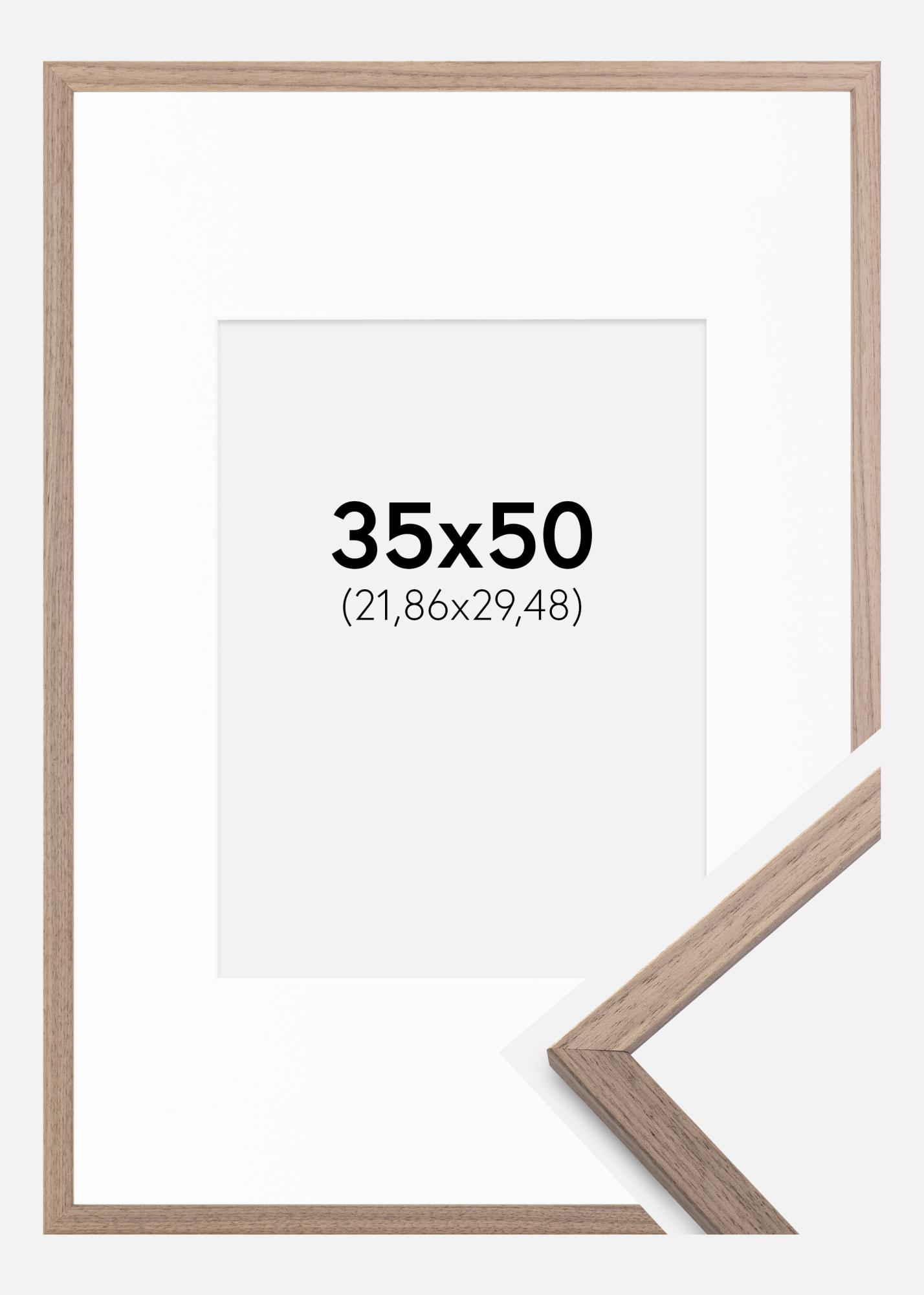 Pakke med bilderamme og passende hvit passepartout. På produktbildet ser du rammens mål (skrevet med fet skrift) og passepartoutens innvendige mål (skrevet i parentes). Merk at passepartoutens innvendige mål alltid må være 1 cm mindre enn ønsket bildestørrelse.