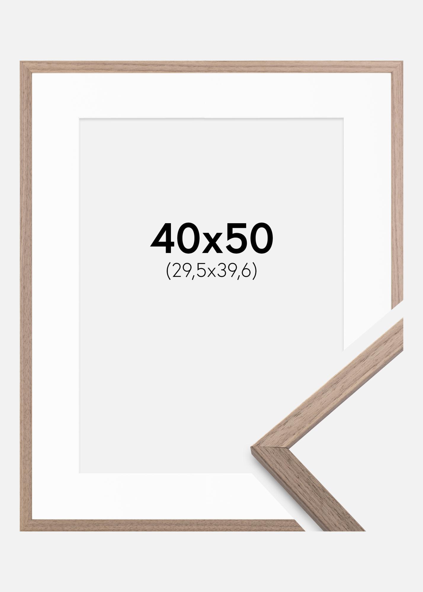 Pakke med bilderamme og passende hvit passepartout. På produktbildet ser du rammens mål (skrevet med fet skrift) og passepartoutens innvendige mål (skrevet i parentes). Merk at passepartoutens innvendige mål alltid må være 1 cm mindre enn ønsket bildestørrelse.