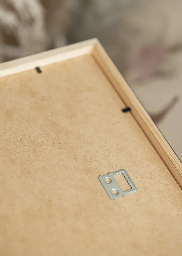 Rammen kan henges opp på veggen både loddrett og vannrett, og den passer like godt alene på veggen som i kombinasjon med andre rammer. På baksiden er det et bakstykke laget av HDF-materiale, som holdes på plass av små stifter. For å sette inn motivet ditt, bøyer du opp stiftene og fjerner bakstykket.