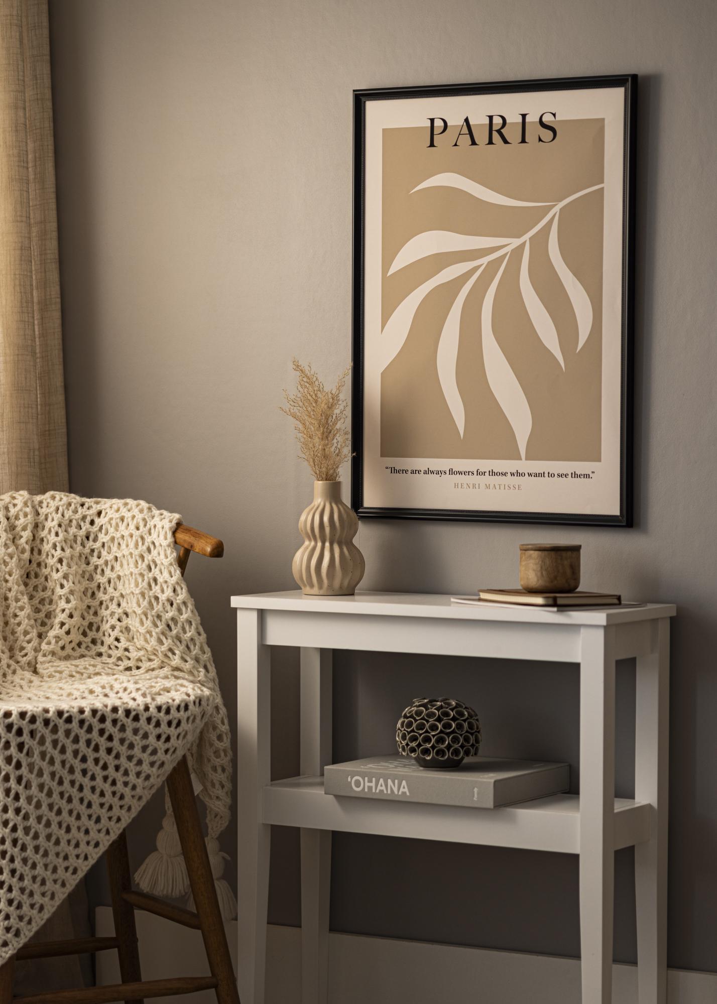Rammen har en matt finish og en hvit passepartout. Den er utstyrt med metalloppheng for både horisontal og vertikal opphengning.