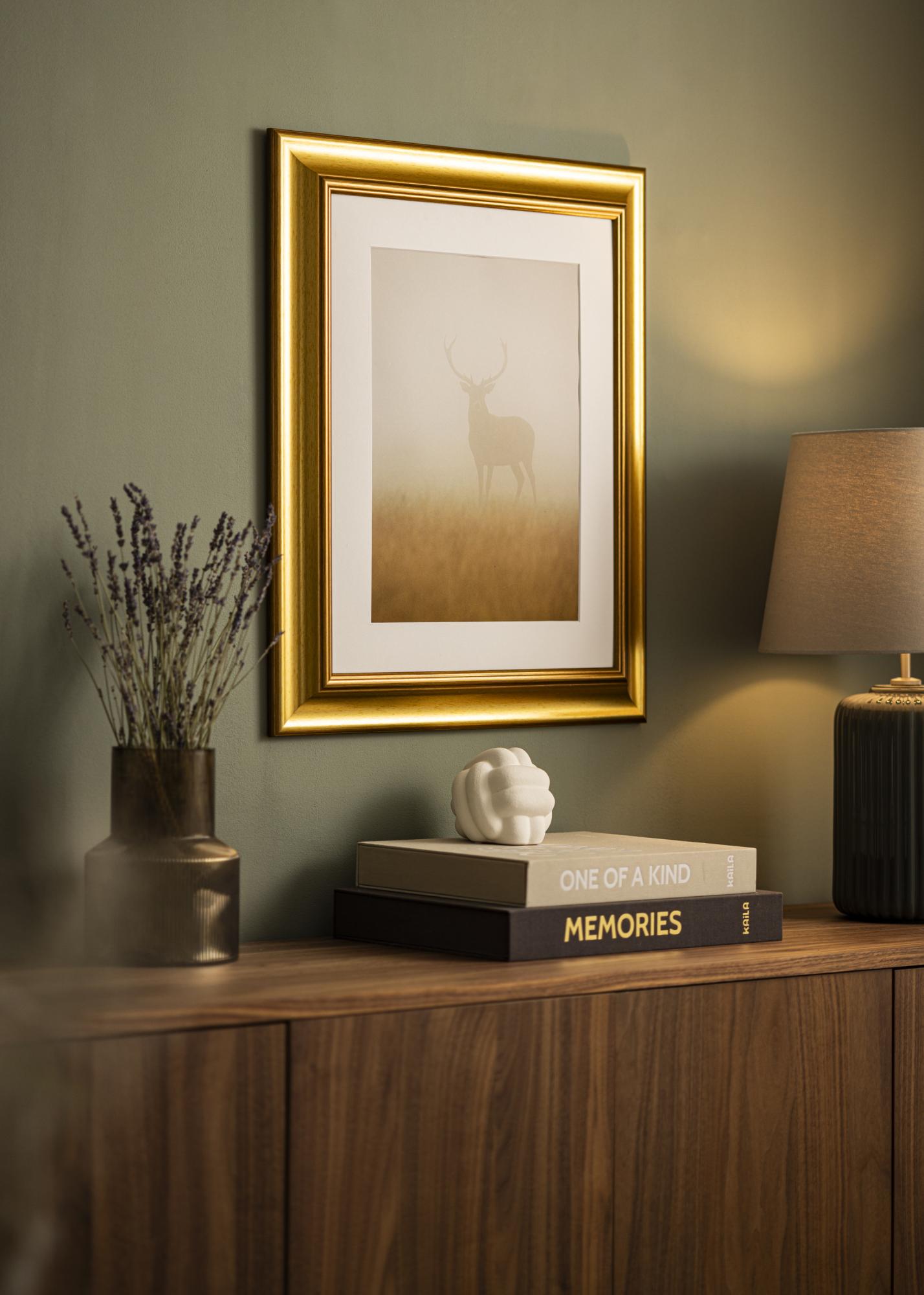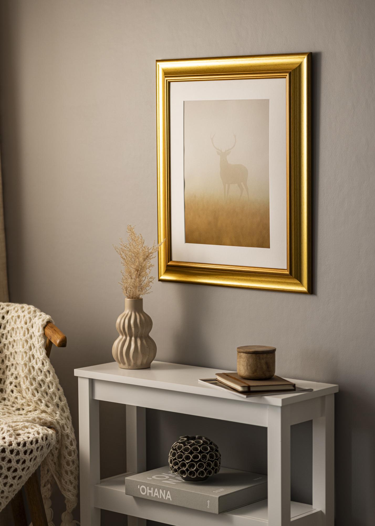 Ram Hampshire Gull er den perfekte løsningen for deg som søker en elegant og personlig innramming til dine bilder eller kunstverk. Med sin distinkte fasning og elegante helling forsterker denne fotorammen lysrefleksjonene på en måte som virkelig fremhever motivet. Den varme, børstede gullfinishen med subtil trestruktur gir en eksklusiv følelse som passer både moderne og klassiske interiører.