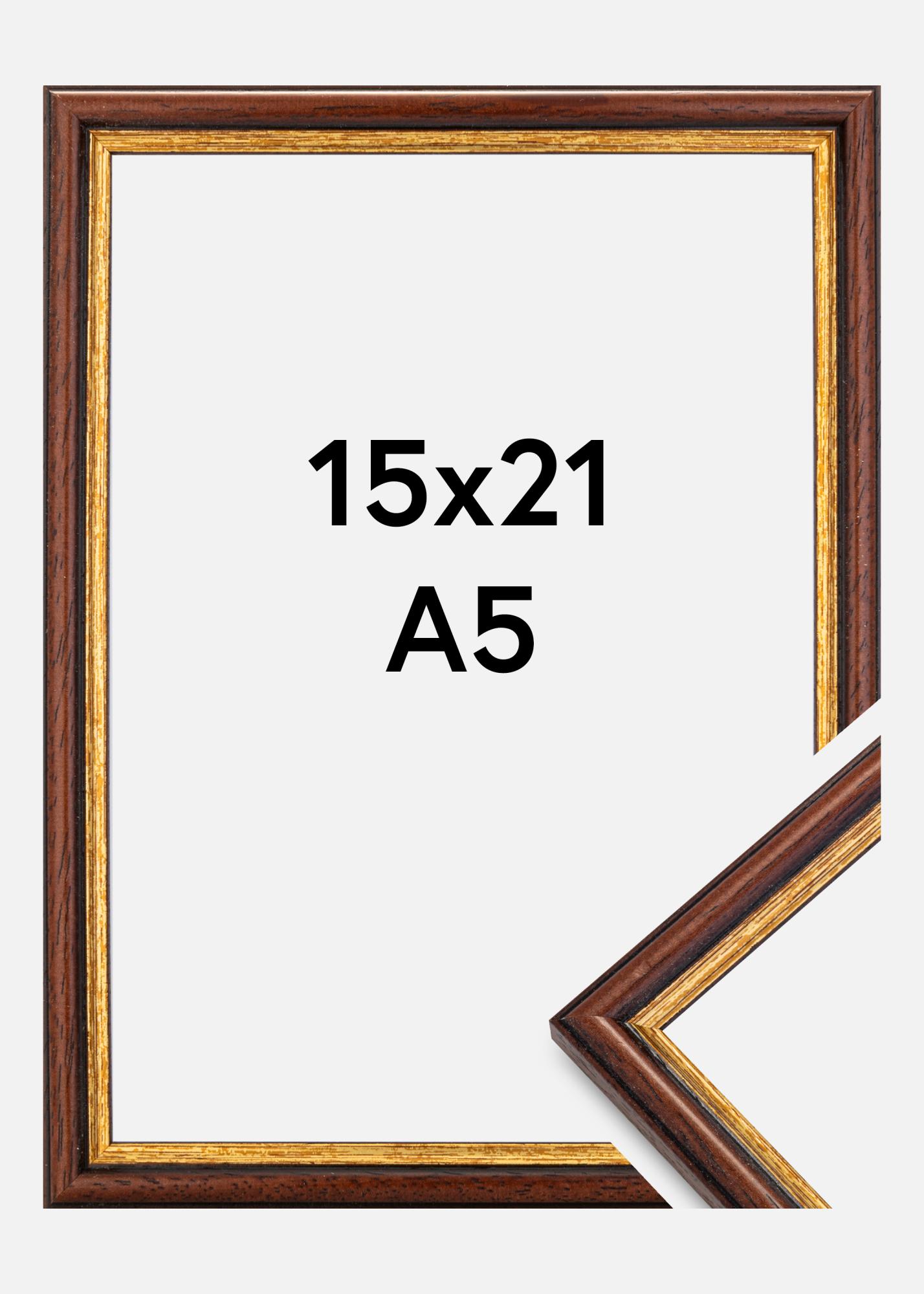Oppdag den tidløse elegansen med vår 15x21 cm (A5) fotoram, en klassisk skjønnhet som forhøyer dine minner med sin varme brune tone og distinkte gullkant. Denne billedrammen er ikke bare en visuell perle, men også praktisk takket være dens fleksible metallhenger som tillater plassering både i landskaps- og portrettinnretning.