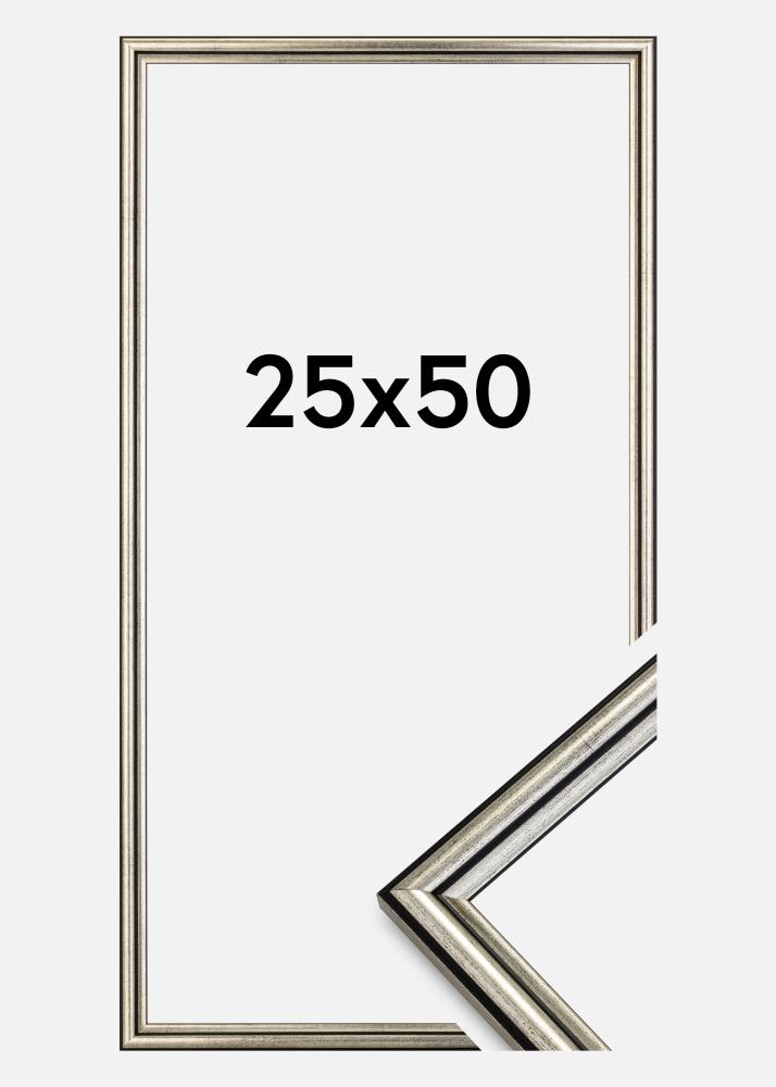 Oppdag elegansen og det sofistikerte designet med vår sølvramp i størrelsen 25x50 cm. Denne fotoramme er en stilren detalj for hjemmet ditt, med sine subtile svartete inslag og svarte linjer som tilfører en unik karakter til din veggdekorasjon.