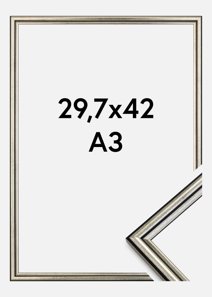 Oppdag elegansen og det moderne designet med vår 29,7x42 cm (A3) sølvramme, perfekt for å fremheve dine favorittverk eller fotografier. Denne fotorammen er en stilig kombinasjon av sølvfargede nyanser med diskrete svartflekklige detaljer og svarte linjer som gir et sofistikert inntrykk.