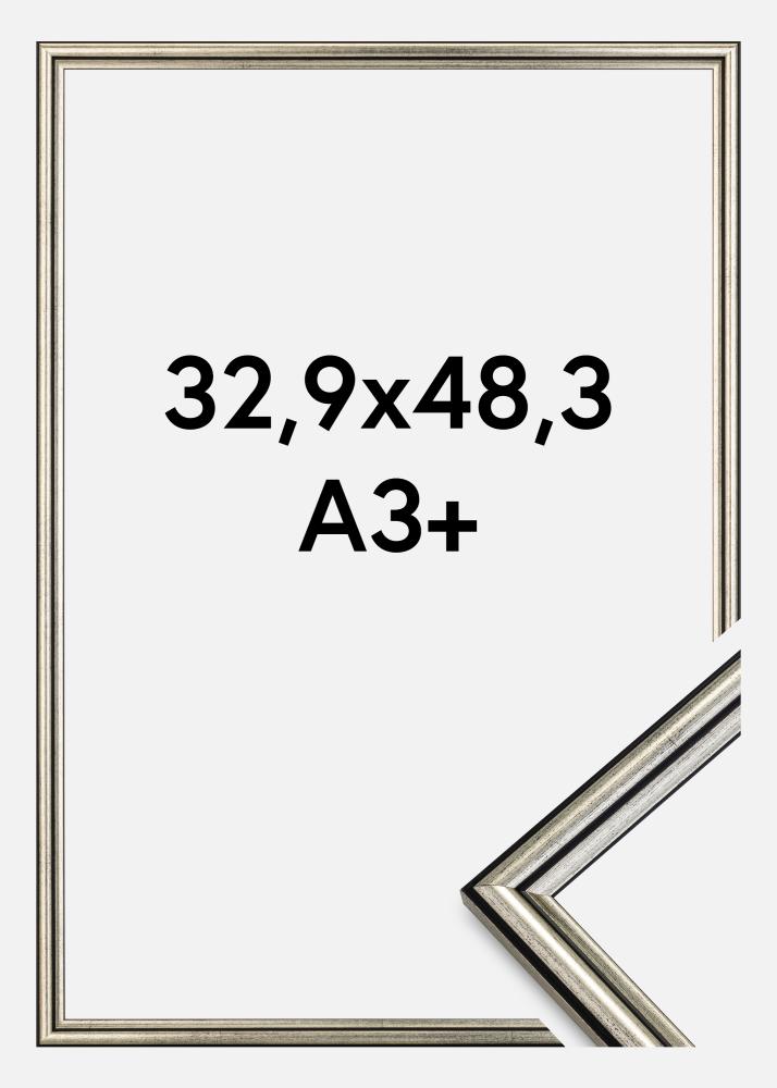 Oppdag den elegante sølvrammen med dimensjonene 32,9x48,3 cm (A3+), en perfekt kombinasjon av stil og funksjon for dine favorittbilder eller kunstverk. Denne fotorammen er spesielt designet for å gi et sofistikert inntrykk med sine svartfargede detaljer og svarte linjer som diskret fremhever rammen sin design.