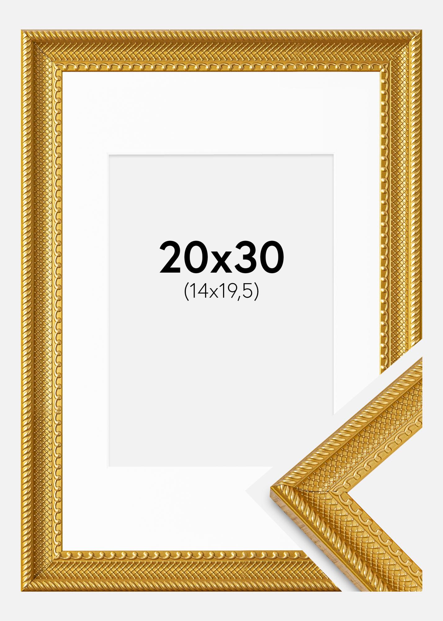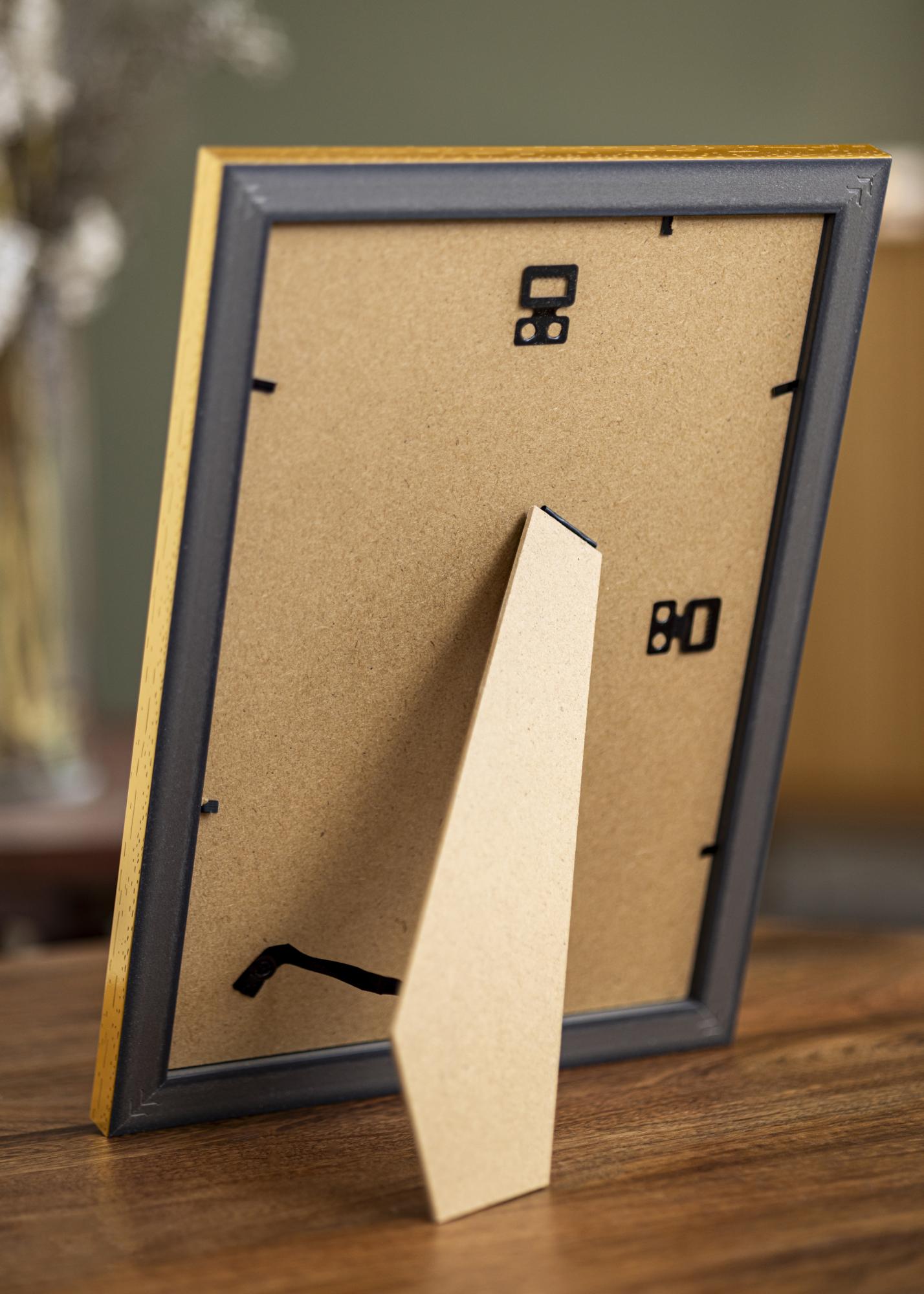 Forvandle bildene dine til kunstverk med vår elegante gullfargede ramme, komplett med en stilren hvit passepartout. Denne rammen er designet for å passe bilder i størrelsen 15x21 cm (A5) og har en total yttermål på 24x34 cm. Med en bredde på 26 mm og en dybde på 19 mm, gir rammen en robust og sofistikert innramming som fremhever dine favorittbilder.