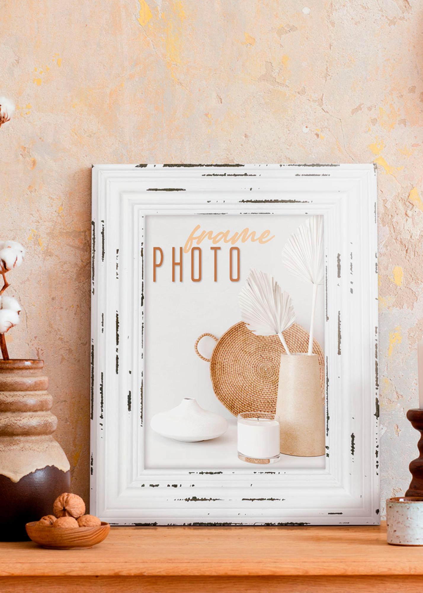 Gi dine minner en unik innramming med denne sjarmerende fotorammen i vintagestil. Med sine dimensjoner på 10x15 cm, passer den perfekt for å fremheve dine favorittbilder. Den slitte hvite overflaten blir supplert av mørke innslag som gir en autentisk følelse av svunne tider.