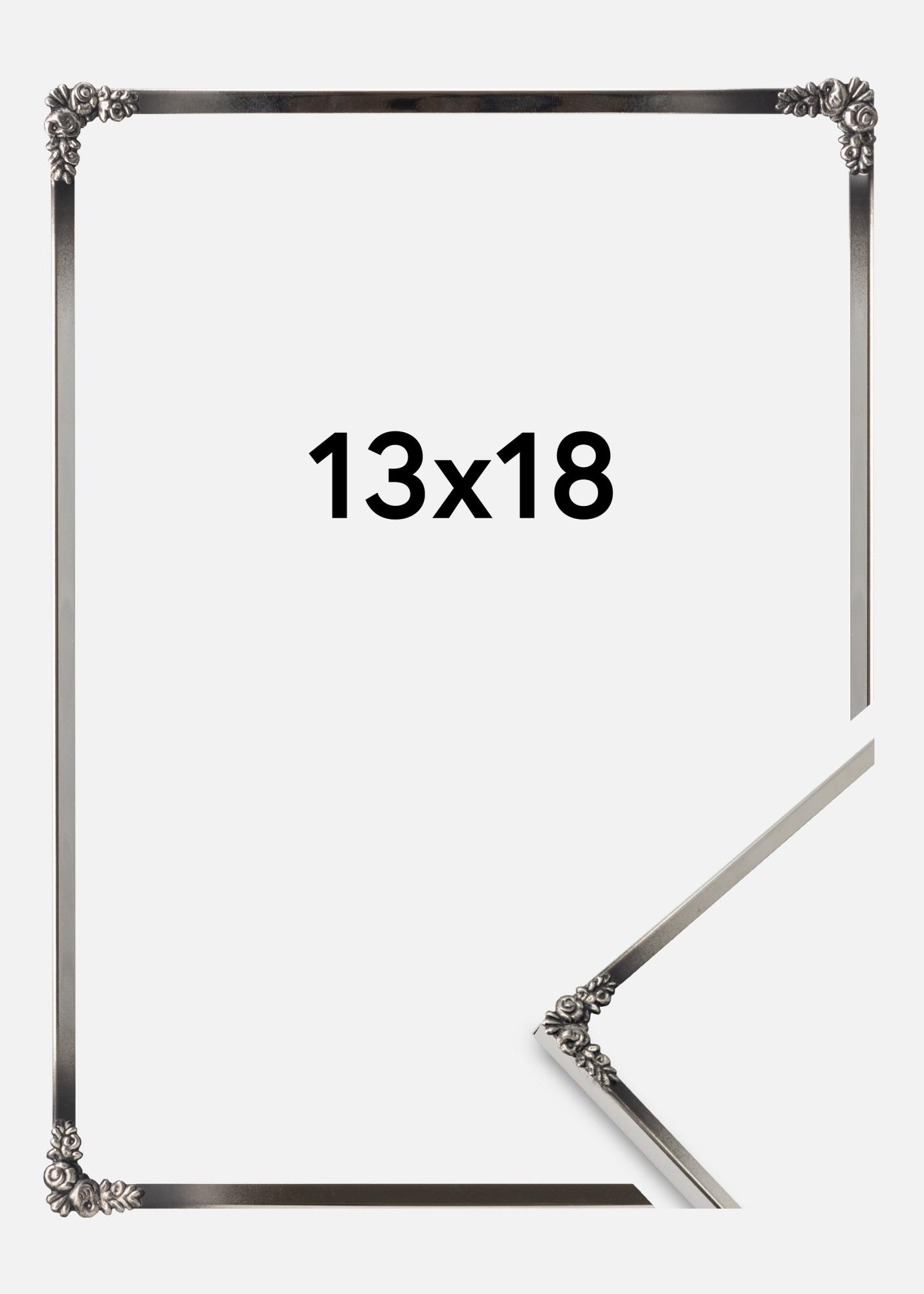 Rosen Metall Sølv er en ramme i klassisk stil, der hvert hjørne er dekorert med små elegante roser. Rammen er laget i sølvfarget metall, og har en lett "brent" finish som bidrar til å skape en ekstra stilfull følelse. På baksiden finnes veggfester og bakstøtte, noe som gjør at rammen både kan plasseres på veggen og som dekorasjon på et møbel.