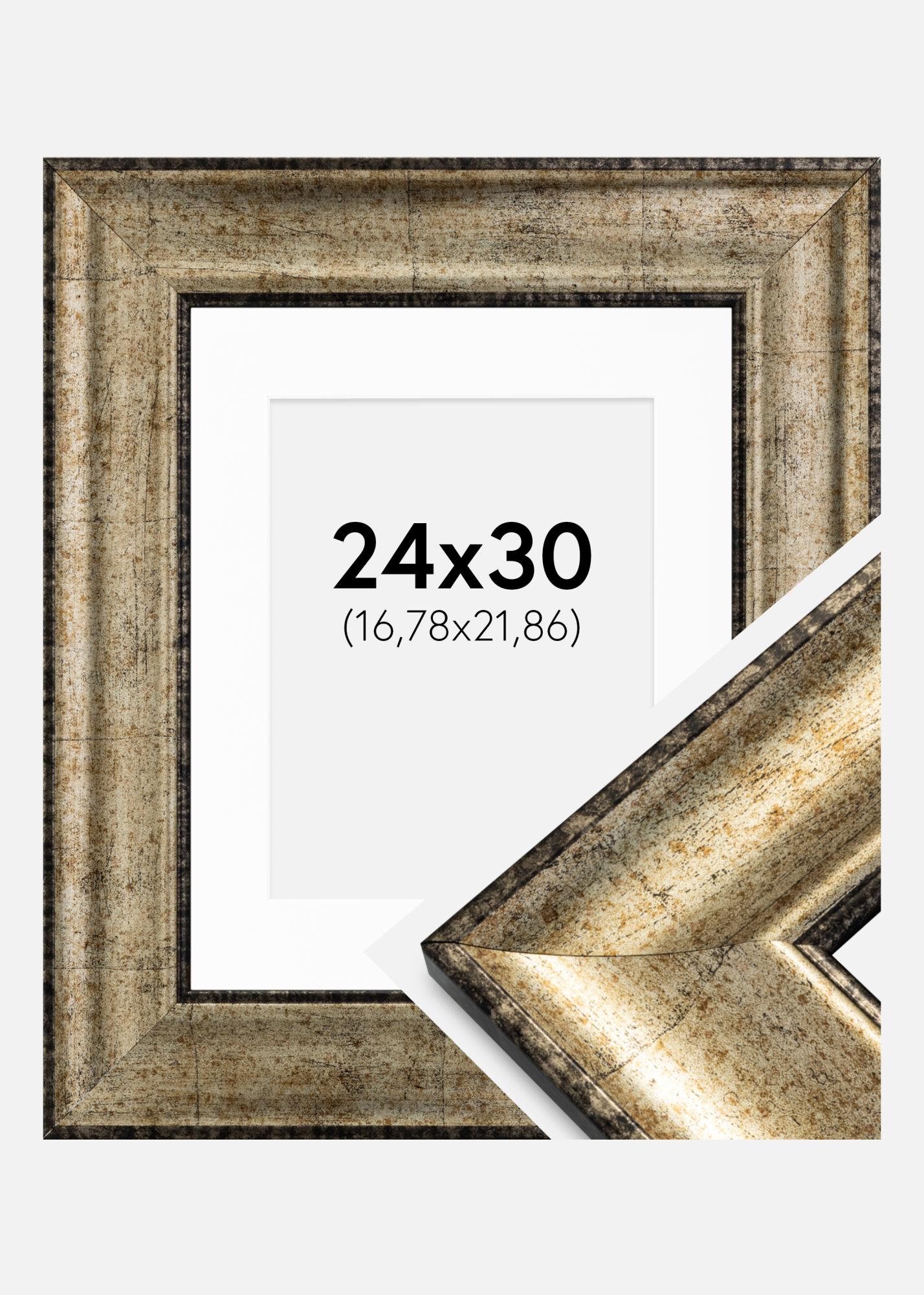 Pakke med bilderamme og passende hvit passepartout. På produktbildet ser du rammens mål (skrevet med fet skrift) og passepartoutens innvendige mål (skrevet i parentes). Merk at passepartoutens innvendige mål alltid må være 1 cm mindre enn ønsket bildestørrelse.