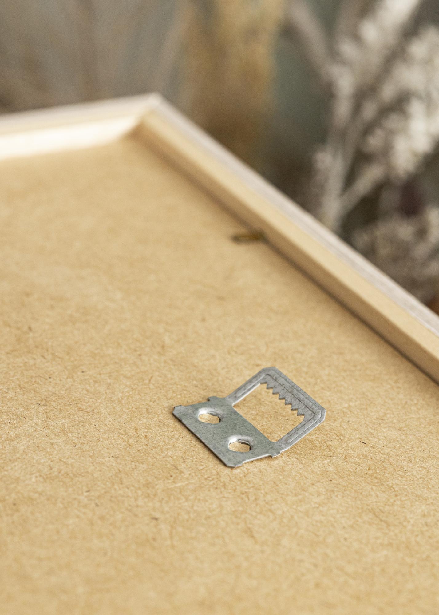 Rammen har ytre mål på 32x42 cm og er utstyrt med metallhengere for både horisontal og vertikal opphenging.