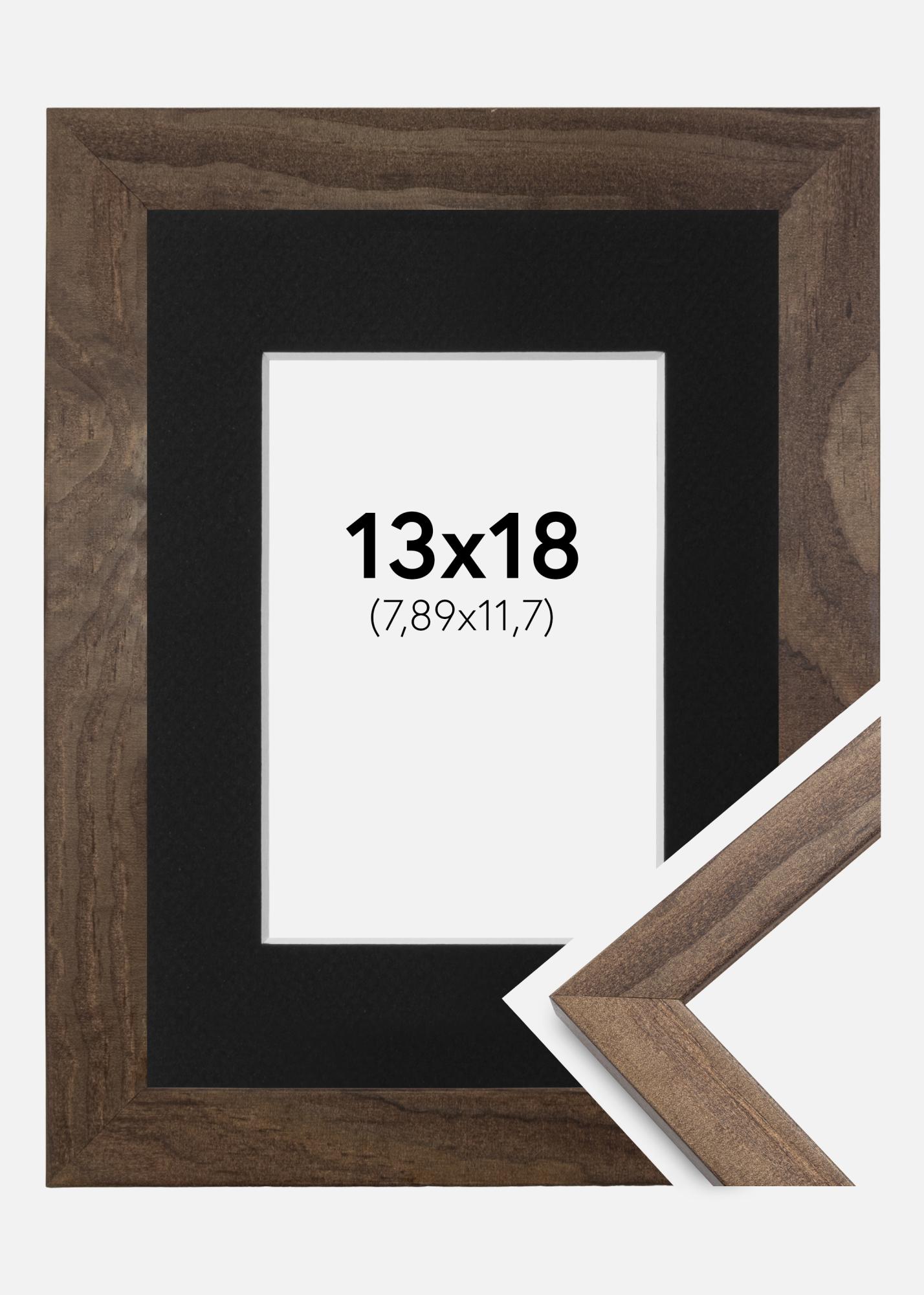 Pakke med bilderamme og passende svart passepartout. På produktbildet ser du rammens mål (skrevet med fet skrift) og passepartoutens innvendige mål (skrevet i parentes). Merk at passepartoutens innvendige mål alltid må være 1 cm mindre enn ønsket bildestørrelse.