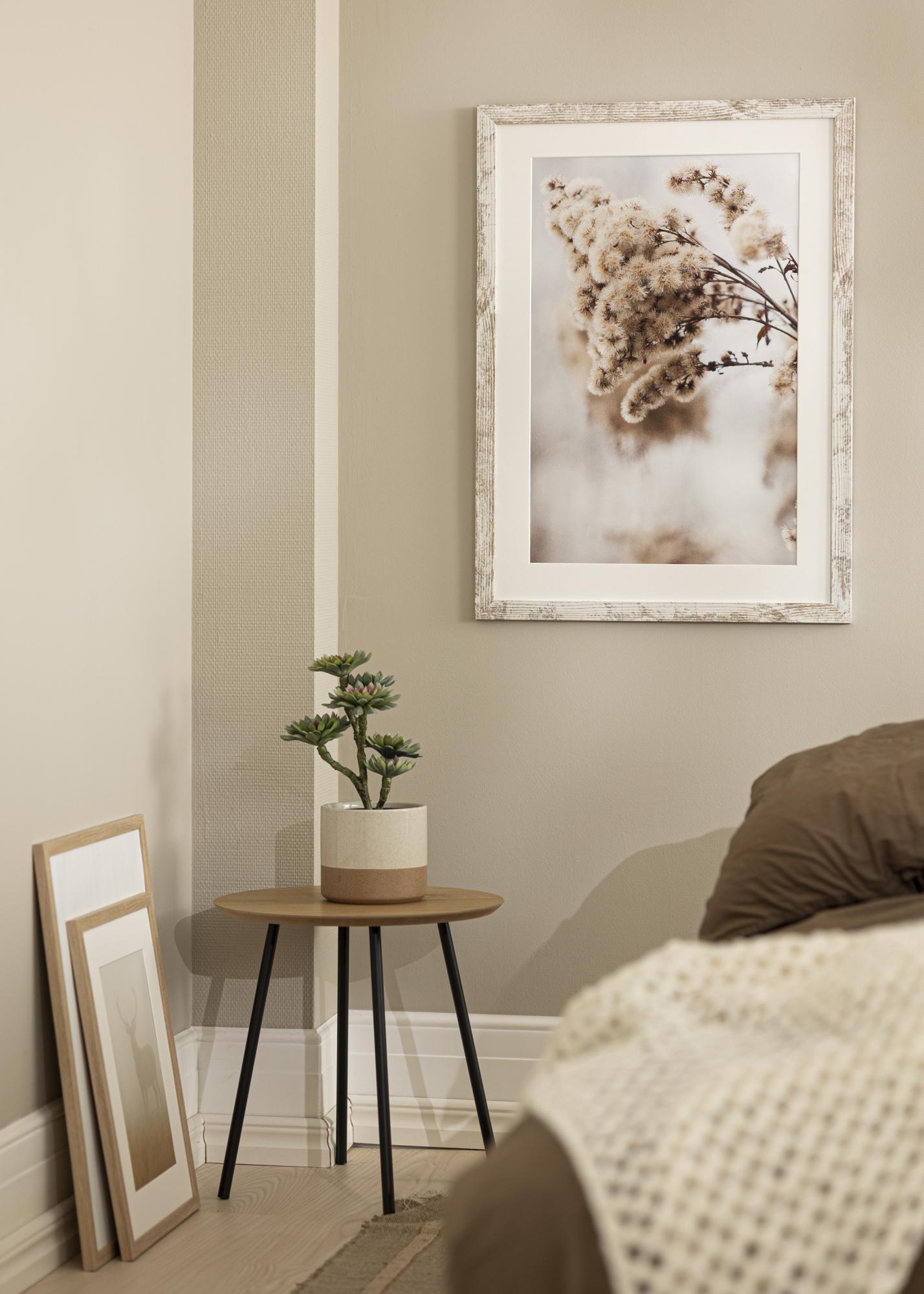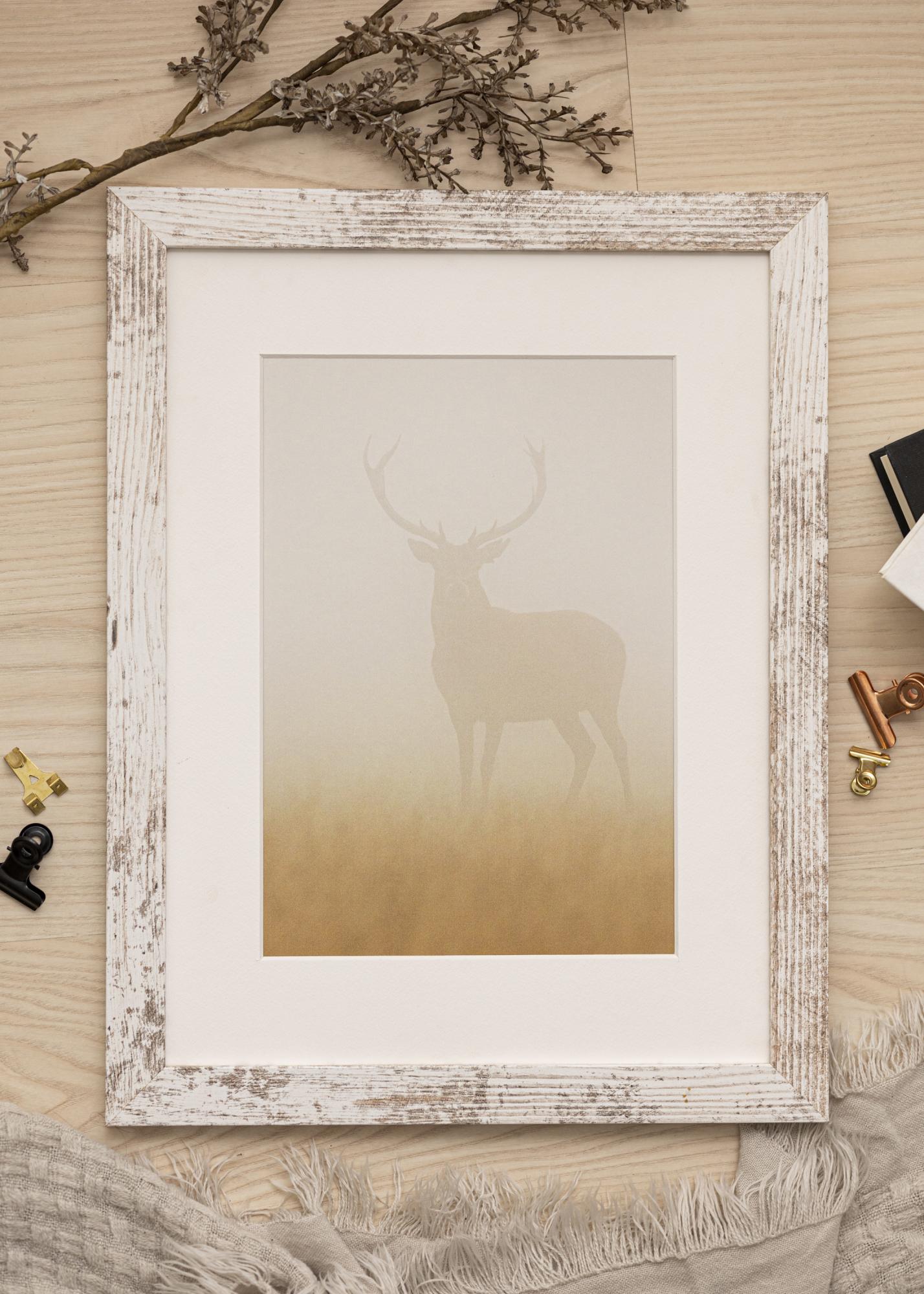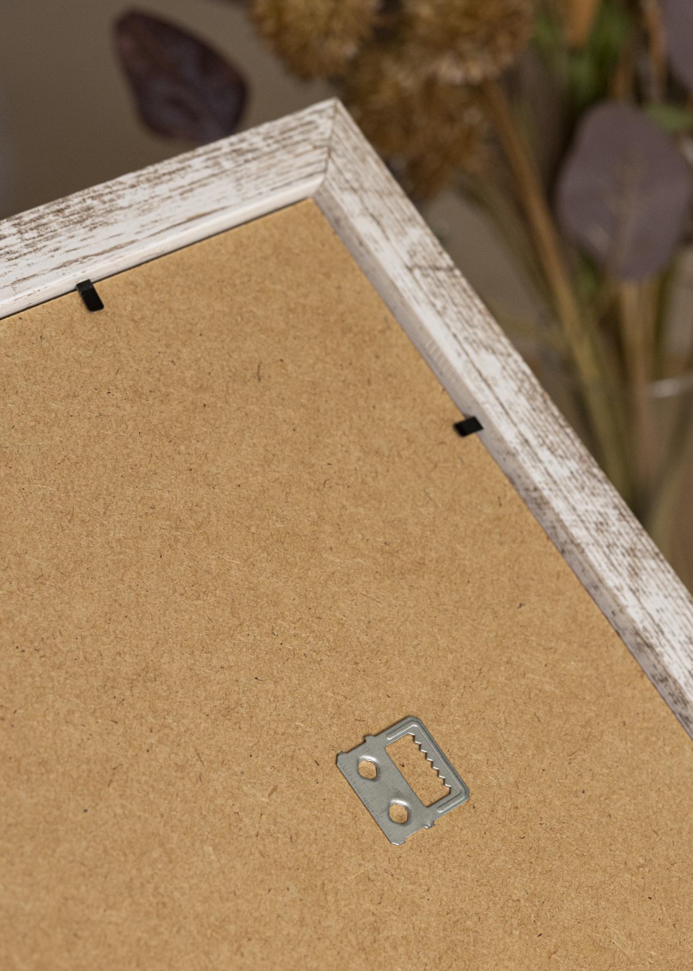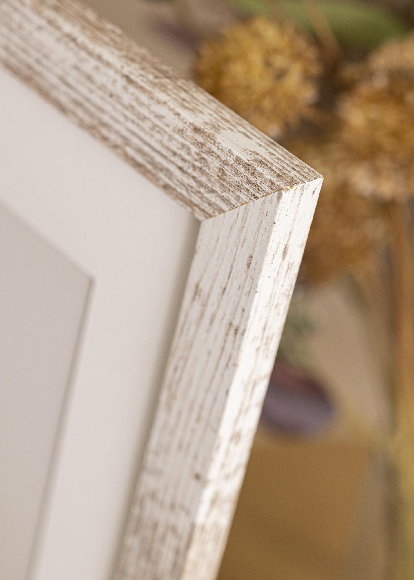 Flott vintageramme med bred rammeprofil med slitt look i hvitt og tre. Gir en ekstra dimensjon til bildene dine, og passer perfekt når du vil ha en ramme med genuin vintagefølelse.