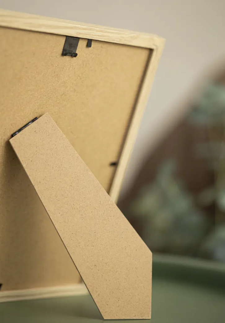 Rammen er laget av MDF-materiale med en foliert eiketre-farget overflate, og har en tynn rammeprofil på 14 mm. Det er god plass til å supplere bildene med en luksuriøs passepartout, siden rammen har en innerdybde på 12 mm.