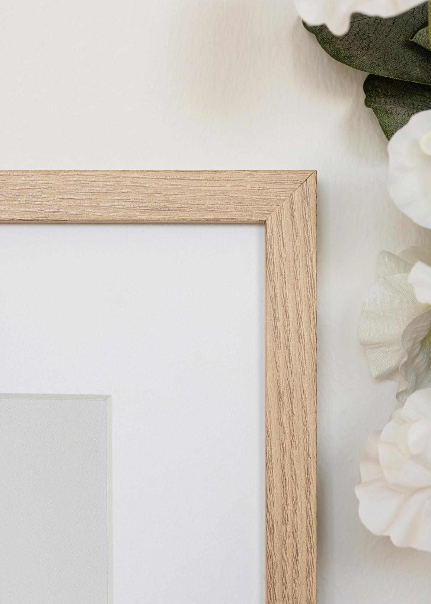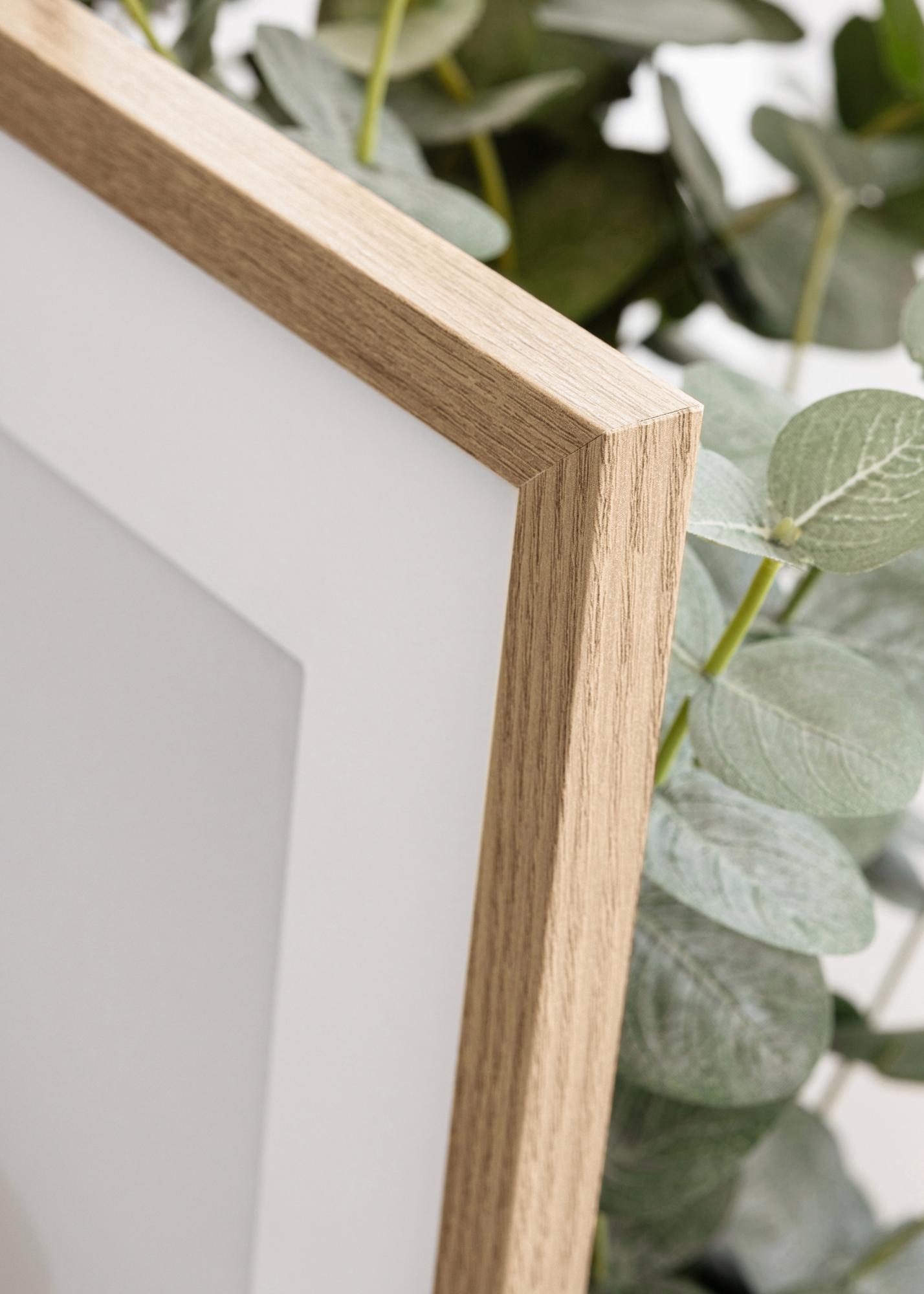 Rammen er laget av MDF-materiale med en foliert eiketre-farget overflate, og har en tynn rammeprofil på 14 mm. Det er god plass til å supplere bildene med en luksuriøs passepartout, siden rammen har en innerdybde på 12 mm.