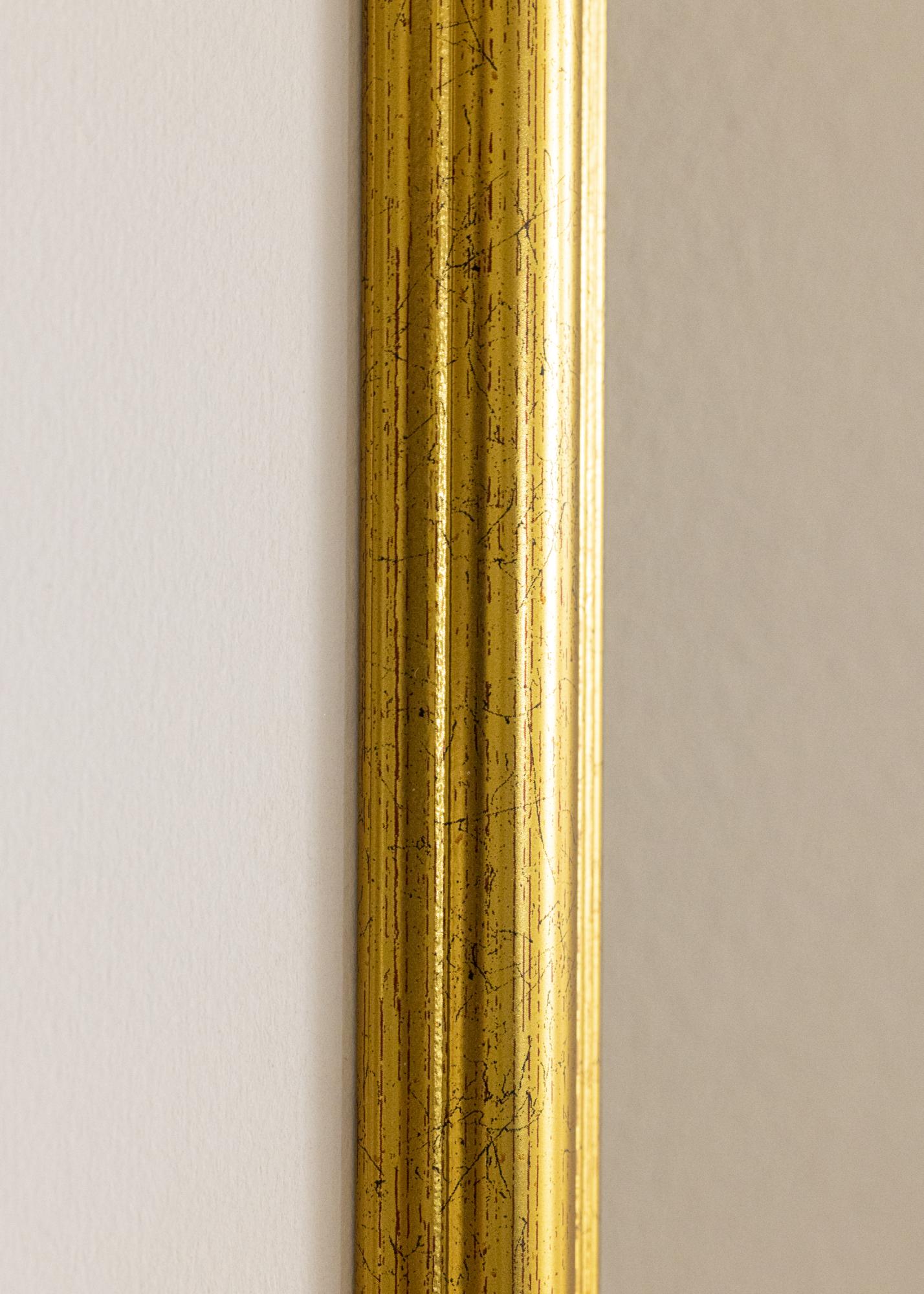 Skap luksus og stil i hjemmet ditt med denne robuste gullrammen med dekorativt utformet profil og en bred list på hele 31 mm. Rammen har en blank overflate med røde prikker, noe som gjør at den får et vakkert, ”slitt” utseende som setter et luksuriøst preg på hjemmet. En staselig fotoramme som denne rammer på en eksklusiv måte inn alle fotografier og plakater, og den passer også godt som en original del av en stor bildevegg.