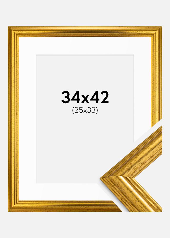 Forvandle bildene dine til kunstverk med vår elegante ramme i gull, komplett med en hvit passepartout. Denne rammen er designet for å passe bilder i størrelsen 26x34 cm og gir en sofistikert innramming som fremhever motivet på en stilfull måte.