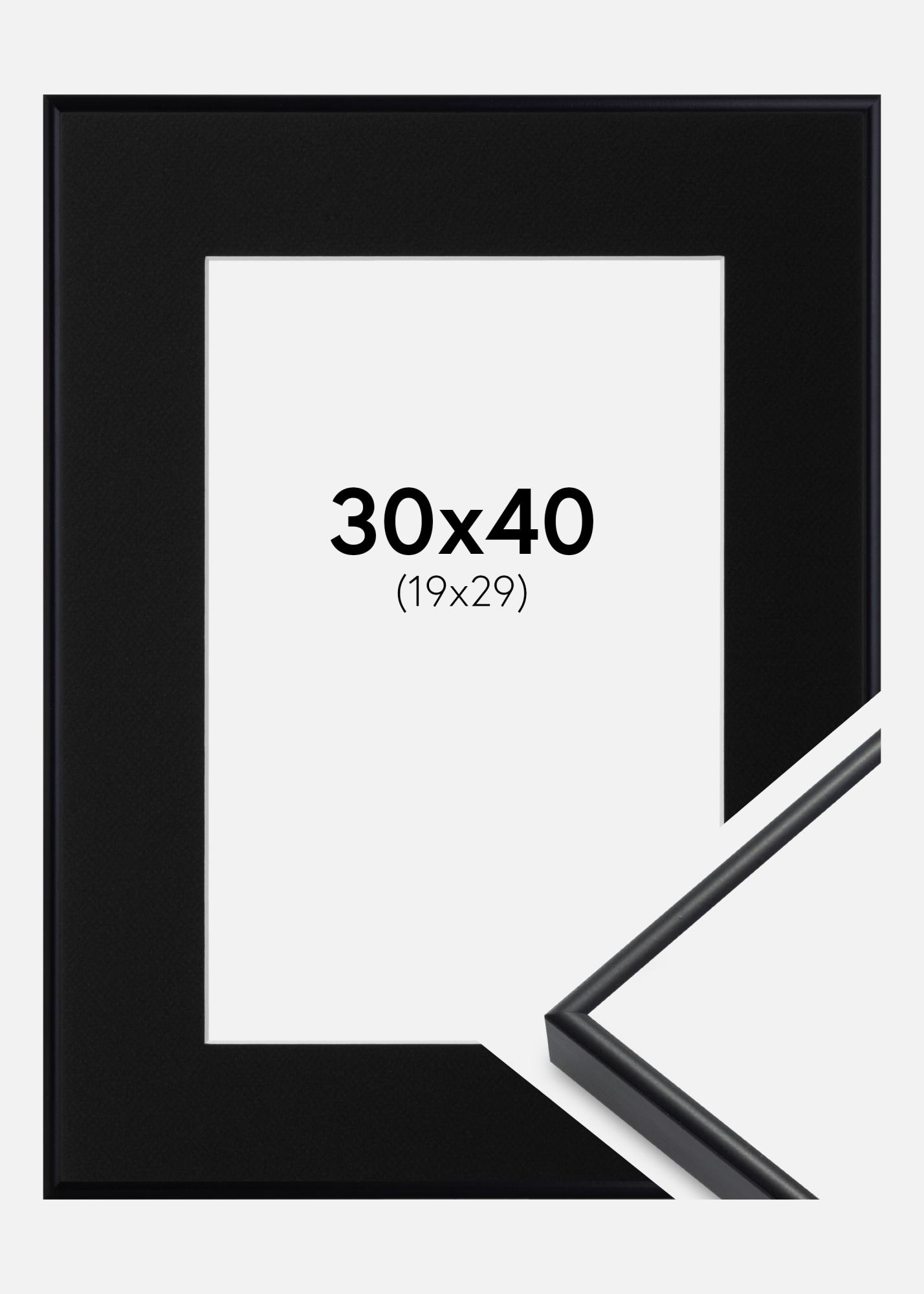 Pakke med bilderamme og passende svart passepartout. På produktbildet ser du rammens mål (skrevet med fet skrift) og passepartoutens innvendige mål (skrevet i parentes). Merk at passepartoutens innvendige mål alltid må være 1 cm mindre enn ønsket bildestørrelse.