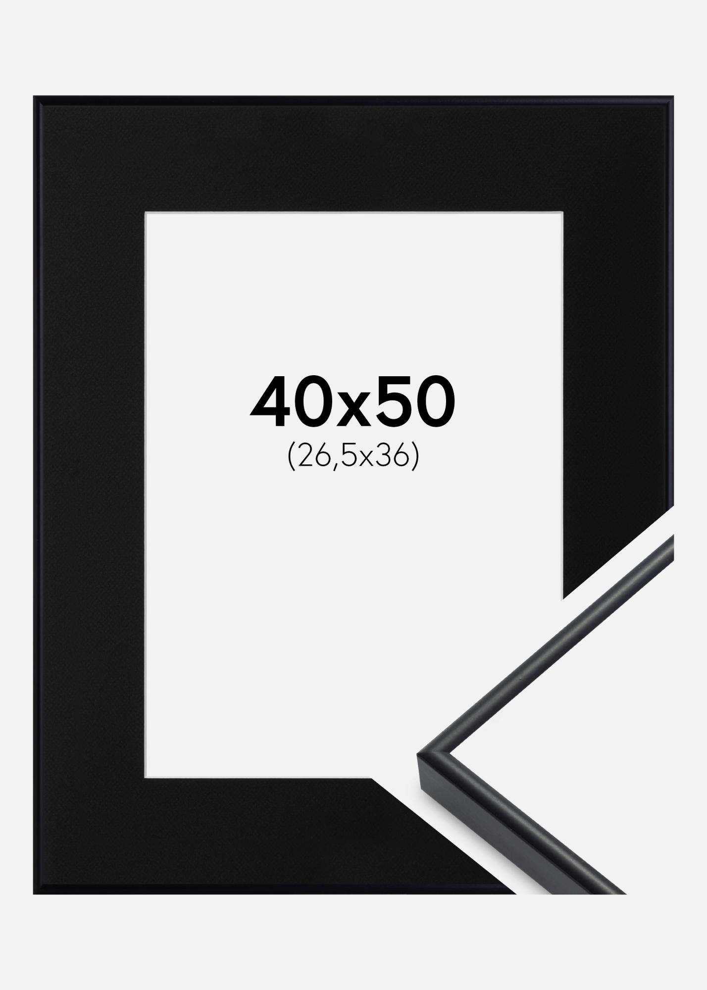 Pakke med bilderamme og passende svart passepartout. På produktbildet ser du rammens mål (skrevet med fet skrift) og passepartoutens innvendige mål (skrevet i parentes). Merk at passepartoutens innvendige mål alltid må være 1 cm mindre enn ønsket bildestørrelse.