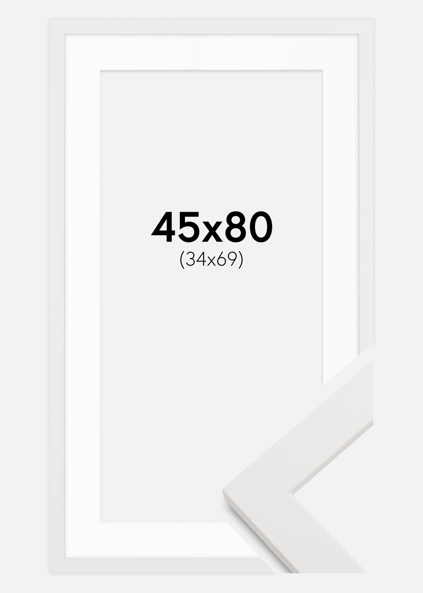 Forvandle dine bilder til kunstverk med vår elegante ramme i hvit finish, komplett med en stilren passepartout. Denne rammen er designet for å passe bilder i størrelsen 35x70 cm og har en total ytterdimensjon på 48,4x83,4 cm. Med en bredde på 22 mm og en dybde på 15 mm gir rammen en subtil men sofistikert innramming som fremhever dine favorittmotiver.