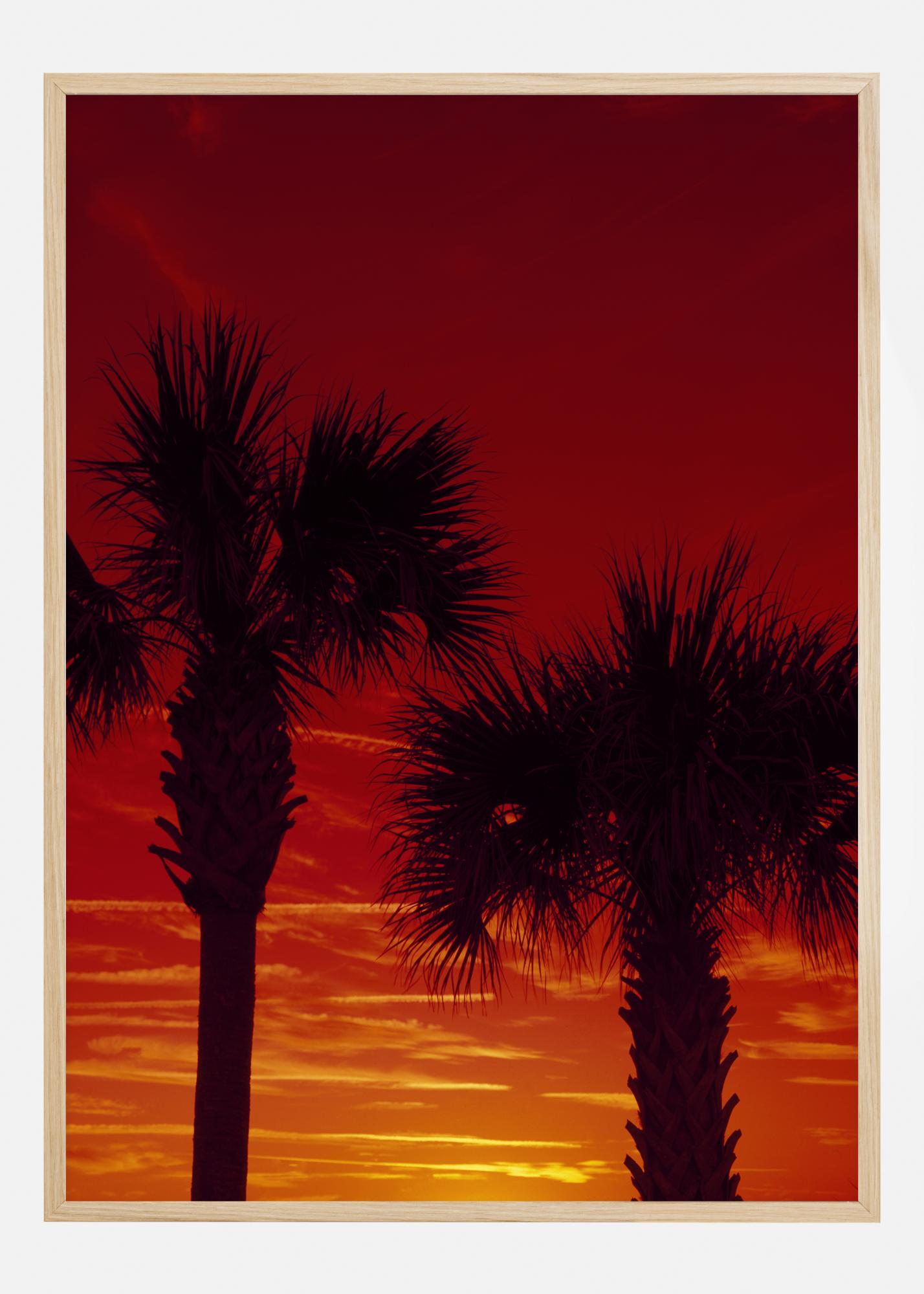 En varselplakat med to silhuetter av palmer mot en dyp rød himmel. Solnedgangen er gul helt nederst, og blir til en mørk rød når den passerer toppene av palmene. Dette skaper et dramatisk utseende som vil få hjertet ditt til å dunke raskt når du henger denne plakaten på en vanlig vegg.