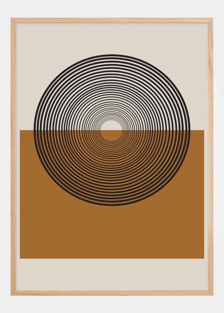 Denne stilige posteren fanger blikket med sitt hypnotiske mønster av svarte linjer som danner en utsøkt optisk illusjon, plassert mot en rik okerbakgrunn som representerer en landskapshorisont. Den øverste halvdelen av sirkelformen gir en følelse av en solnedgang eller måneoppgang, mens de sveipende linjene skaper en følelse av bevegelse og dybde, som gir dette kunstverket en retro følelse med en moderne vri.