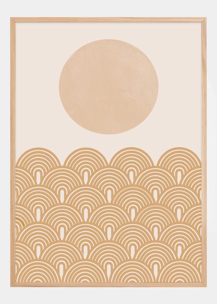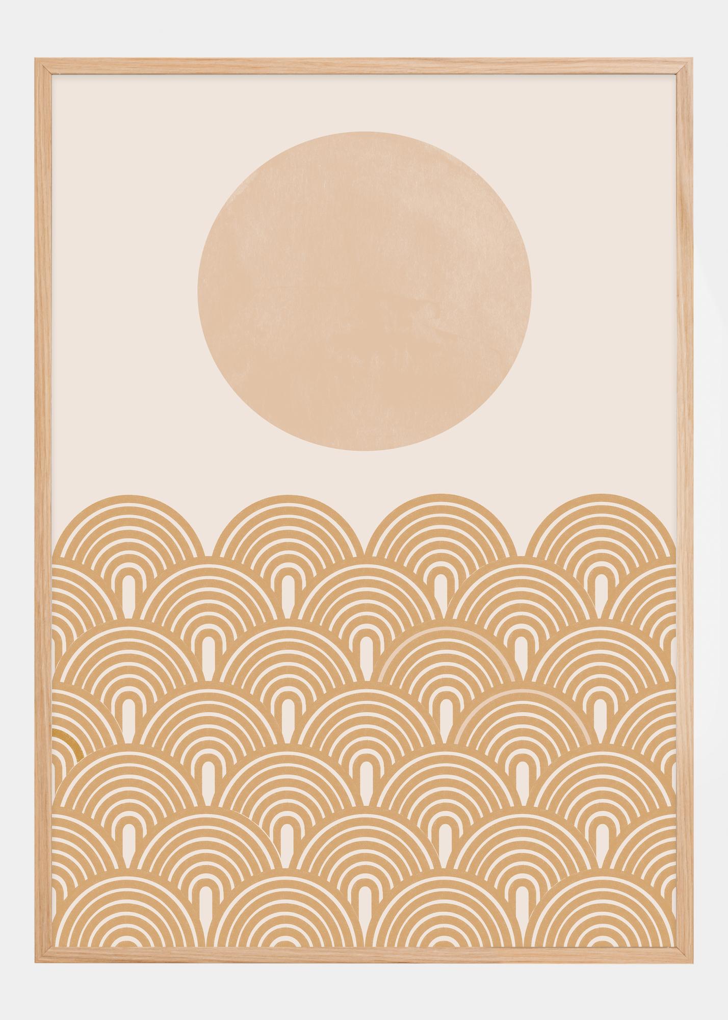 Denne plakaten er en solrik tolkning av retrostiler og sommervibber, der en stor blekrosa sirkel svever over et mønster av buede elementer i en varm terrakottatone. Buene er sammenkoblet på en måte som minner om bølger eller åser, og gir en følelse av bevegelse og livlighet. Den myke fargepaletten bidrar til en følelse av varme og ro.