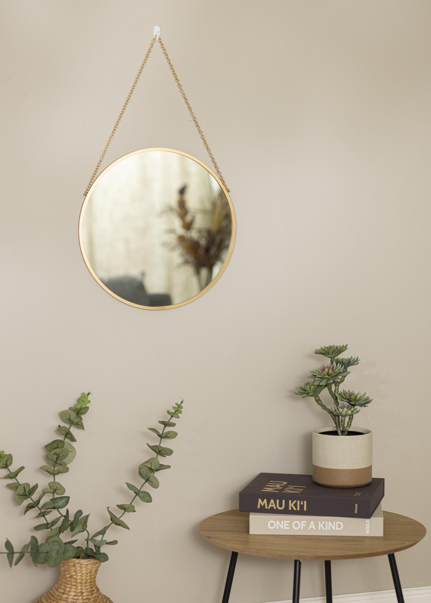La dette veggspeilet gjøre hjemmet ditt elegant! Speilet har et sofistikert utseende med rund form og en tynn speilramme med en dybde på bare 8 mm. Den nette rammen er laget av metall og har en eksklusiv gullfarge. Det elegante inntrykket gjøres komplett av gullenken som brukes til opphenging.
