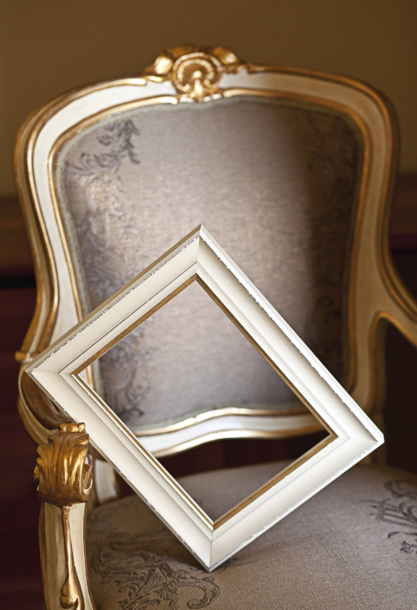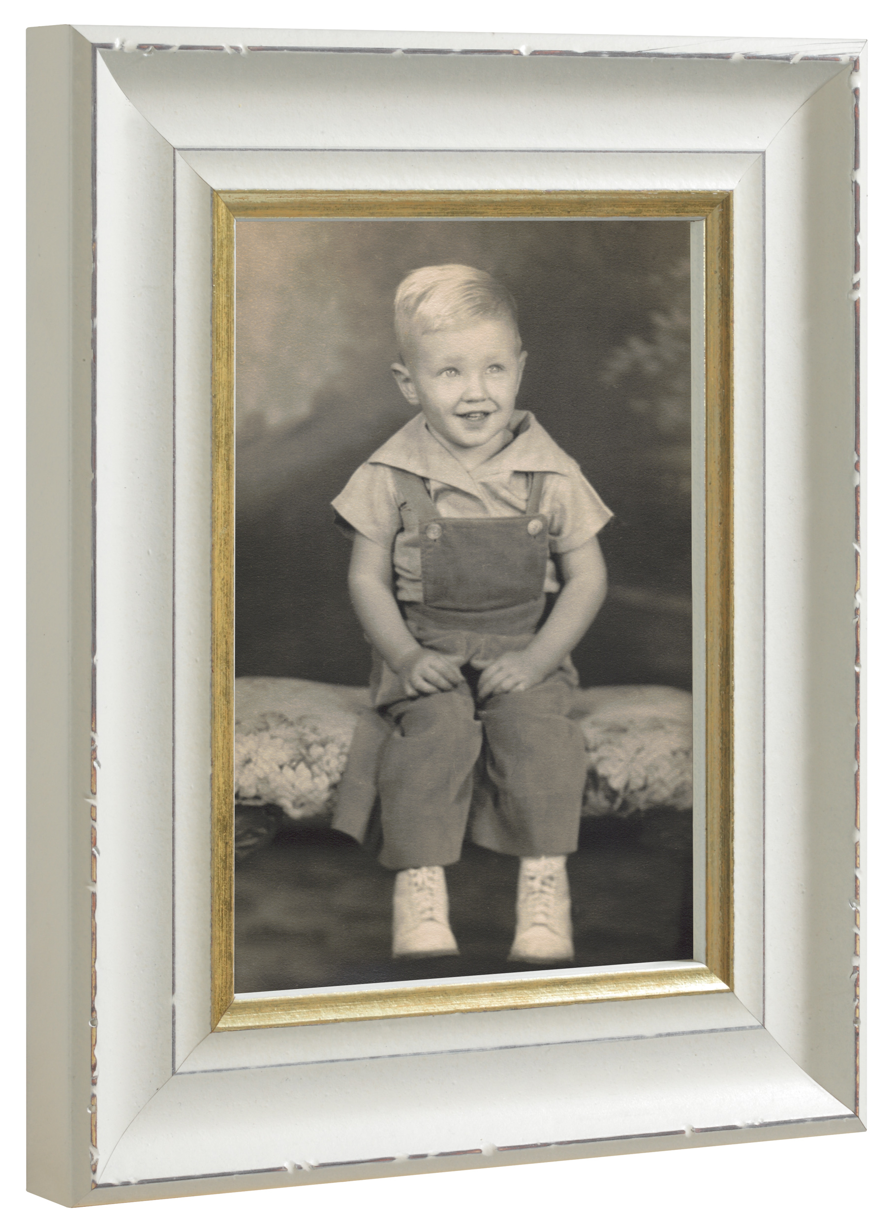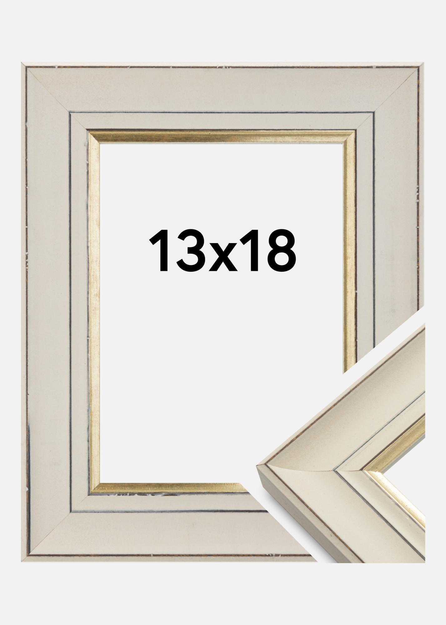 Fotoramme i klassisk stil med et spennende retrouttrykk. Rammen har en røff profil i hvitt med en pen gullkant nærmest motivet. Med sitt nøytrale design og fargevalg er dette en ramme som passer i nesten alle miljøer og til alle typer motiv.