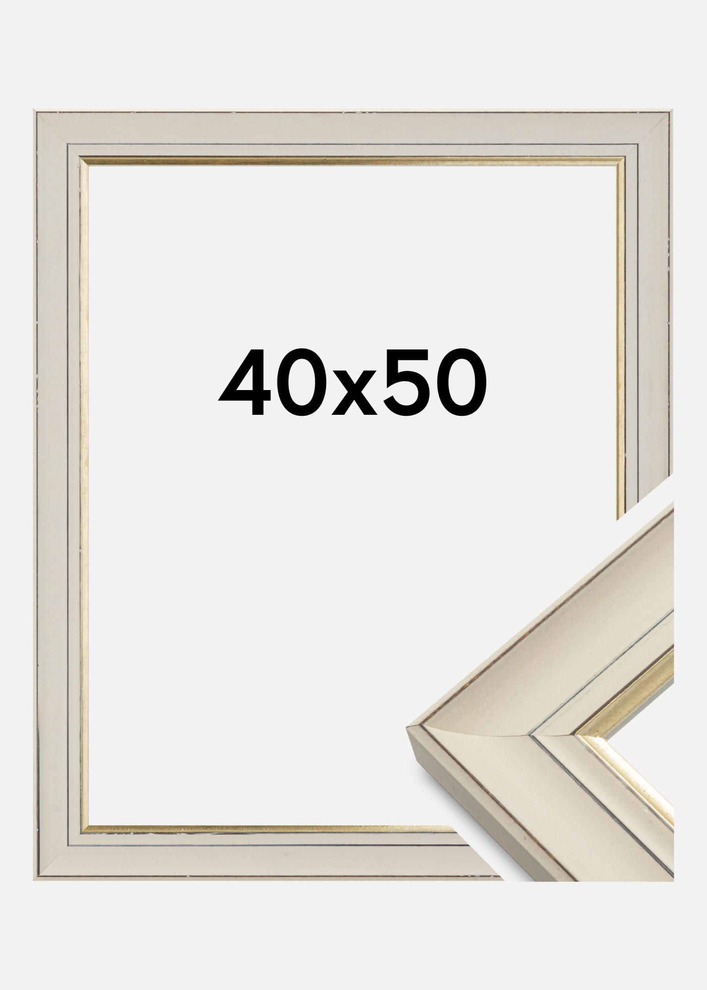 Fotoramme i klassisk stil med et spennende retrouttrykk. Rammen har en røff profil i hvitt med en pen gullkant nærmest motivet. Med sitt nøytrale design og fargevalg er dette en ramme som passer i nesten alle miljøer og til alle typer motiv.