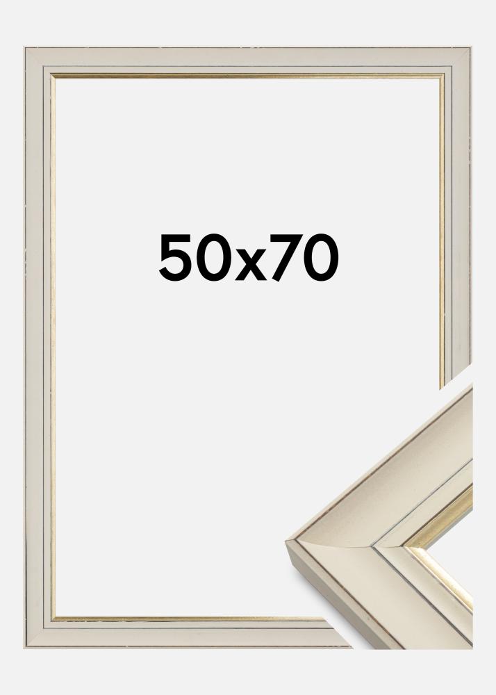 Fotoramme i klassisk stil med et spennende retrouttrykk. Rammen har en røff profil i hvitt med en pen gullkant nærmest motivet. Med sitt nøytrale design og fargevalg er dette en ramme som passer i nesten alle miljøer og til alle typer motiv.
