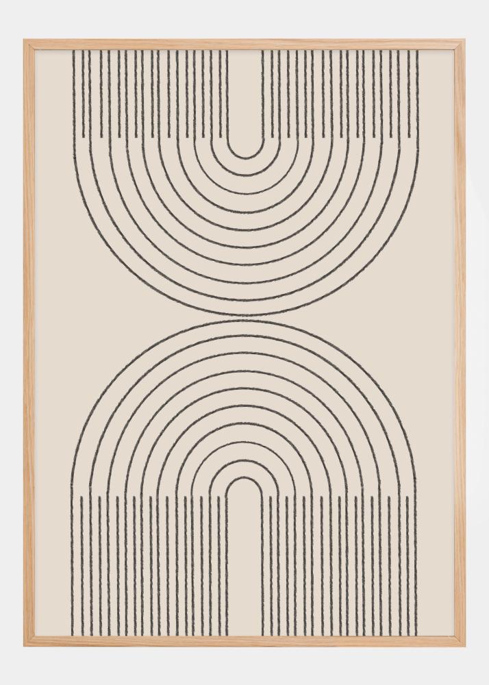 Denne minimalistiske plakaten fanger essensen av enkelhet med sin strømlinjeformede arkitektoniske design. De stilrene buene, tegnet med presisjon, skaper en følelse av ro og struktur, mens den svarte på hvit bakgrunn gir en tydelig visuell kontrast som er både dristig og enkel. Denne kunstneriske representasjonen er både moderne og tidløs, passende for en rekke ulike interiørstiler.