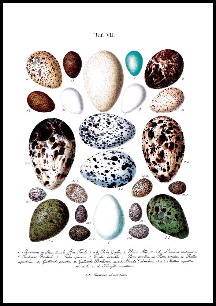 Liker du farge og form? Da har du kanskje tenkt over at naturen er den ulitmate designeren! Denne plakaten er en kopi av en gammel skoleplansje som viser ulike fugleegg. Under de fargerike eggene står det tall som viser til en beskrivende, latinsk tekst. Teksten beskriver hvilken fugleart som tilhører de ulike eggene. En veldig vakker plakat for deg som liker å kombinere vintage med naturfarger! Ettersom plakaten finnes i flere ulike størrelser finner du enkelt en som passer akkurat deg. Kompletter gjerne med en fin ramme fra vårt store sortiement.