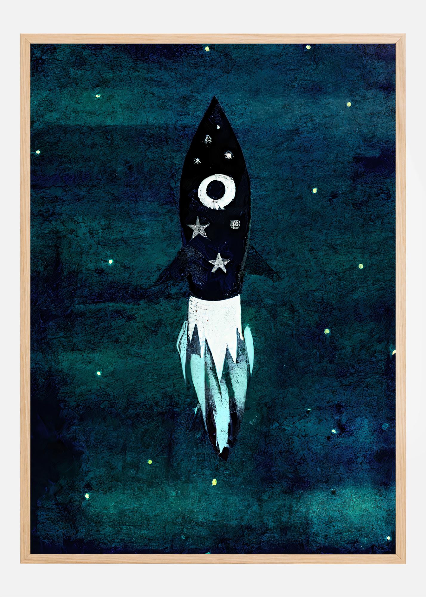 Fremhev en stjerneklar fantasi med denne plakaten, som avbilder en rakett på en oppdagelsesferd gjennom et fargesprakende kosmos. Den dypt mettede blå bakgrunnen er bestrødd med lyspunkter som ligner stjerner og gir en illusjon av et uendelig rom. Raketten selv, dekorert med sølvstjerner og månen, blir et symbol på menneskehetens drøm om romferder og utforskning av det ukjente.