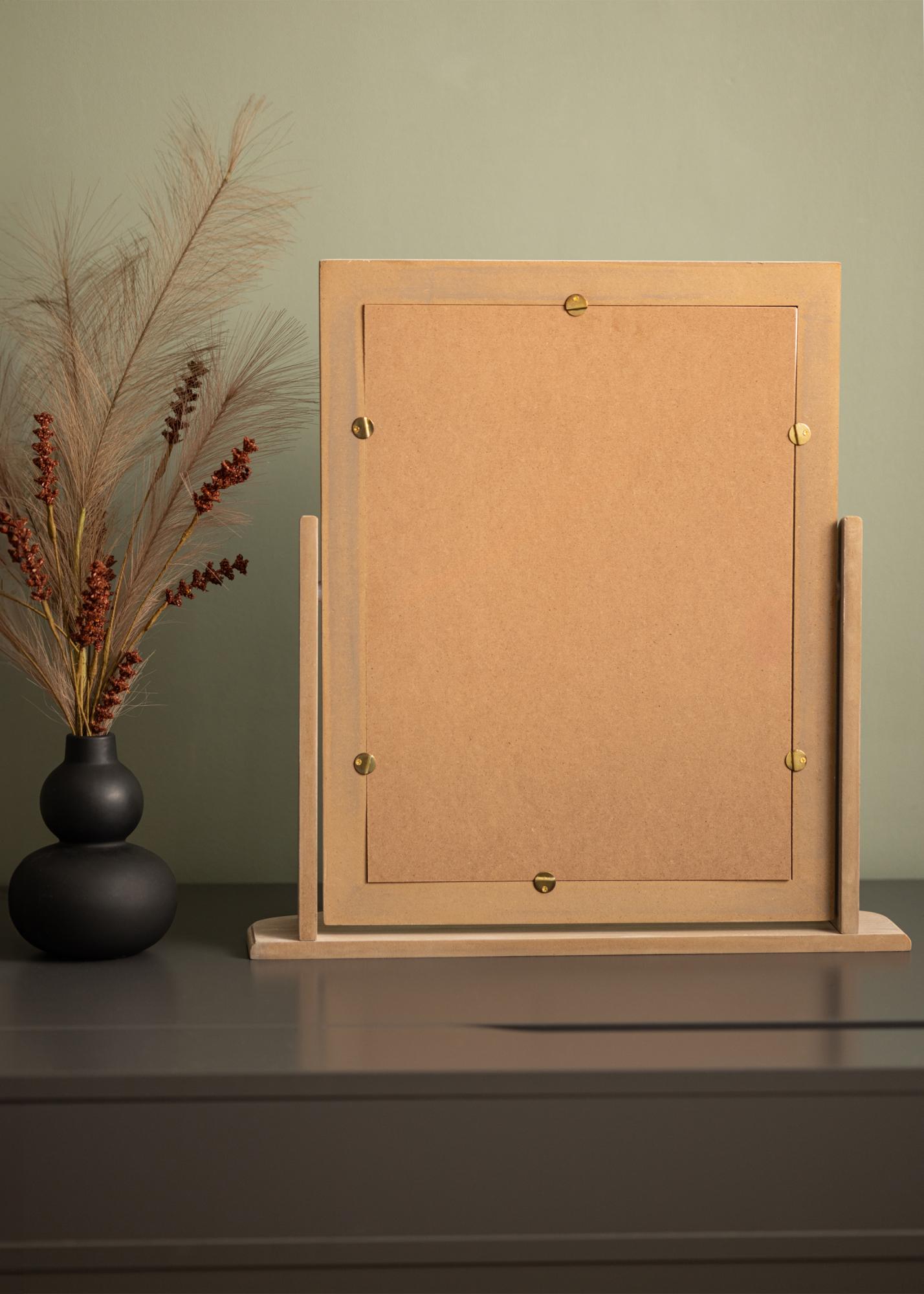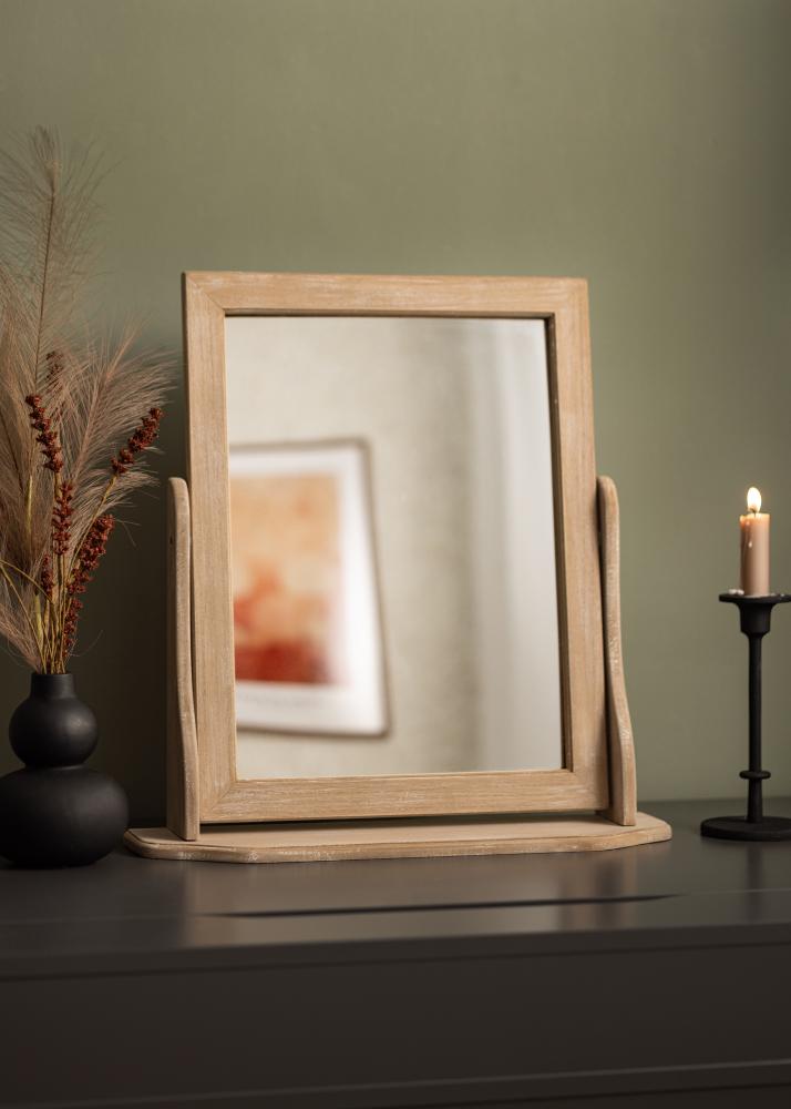 Speilet står stødig på en solid fot, designet for å plasseres på et sminkebord eller en kommode. Den rektangulære formen er klassisk og gir en myk touch til rommet, samtidig som det klare refleksjonen sikrer at du ser deg selv i det beste lyset.