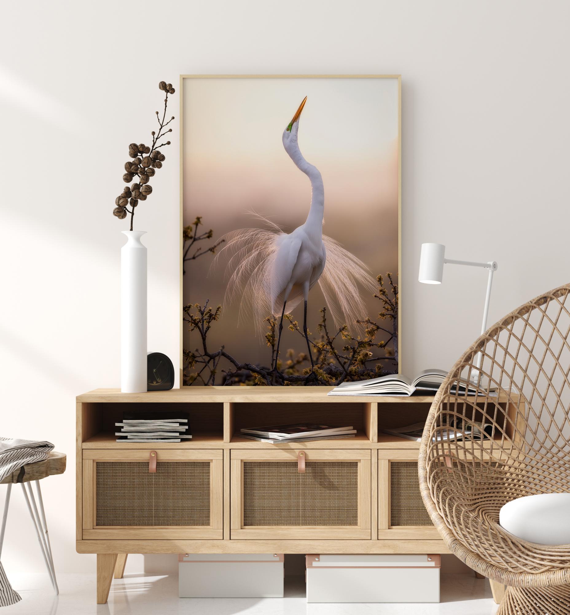 En dyrelivsplakat av en stork som danser i morgenlyset. Den skaper en surrealistisk scene der den står høy og hvit, med soloppgangen som titter forsiktig gjennom fjærene dens. Stå opp med dette vidunderlige trykket hver morgen.
