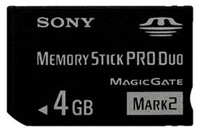 Memory Stick Pro Duo Mark 2 från Sony med en lagringskapacitet på 4 GB. Memory Stick används främst i olika apparater från Sony.