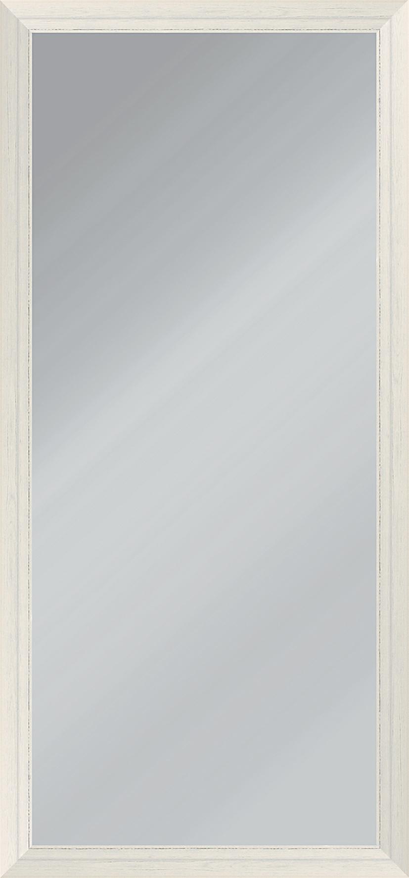 Stilrent og antikkhvitt speil i tre, der man kan se treverket gjennom fargen. Et speil med en form som gjør at det passer til å brukes som helfigursspeil i gangen eller garderoben, men det kan også henges opp ovenfor en skjenk eller sofa i stua. Det rene formspråket gjør at speilet passer inn i alle typer miljøer, enten det er ovenfor bufféen i kjøkkenet eller garderoben i et treningsstudio. Ved å plassere speilet på motsatt side av et vindu, får man følelsen av at rommet er større enn det egentlig er og det tilfører mer naturlig lys.
