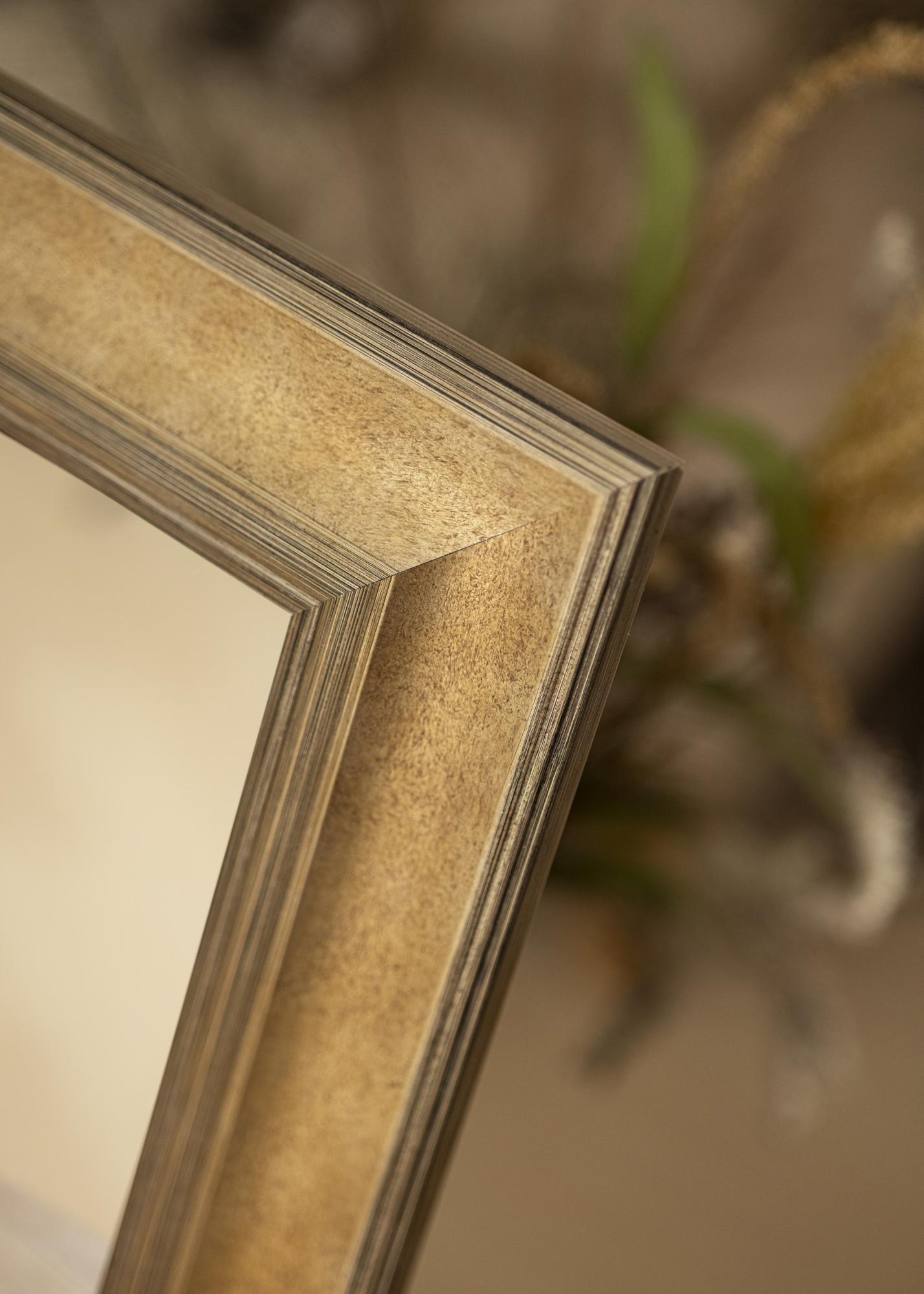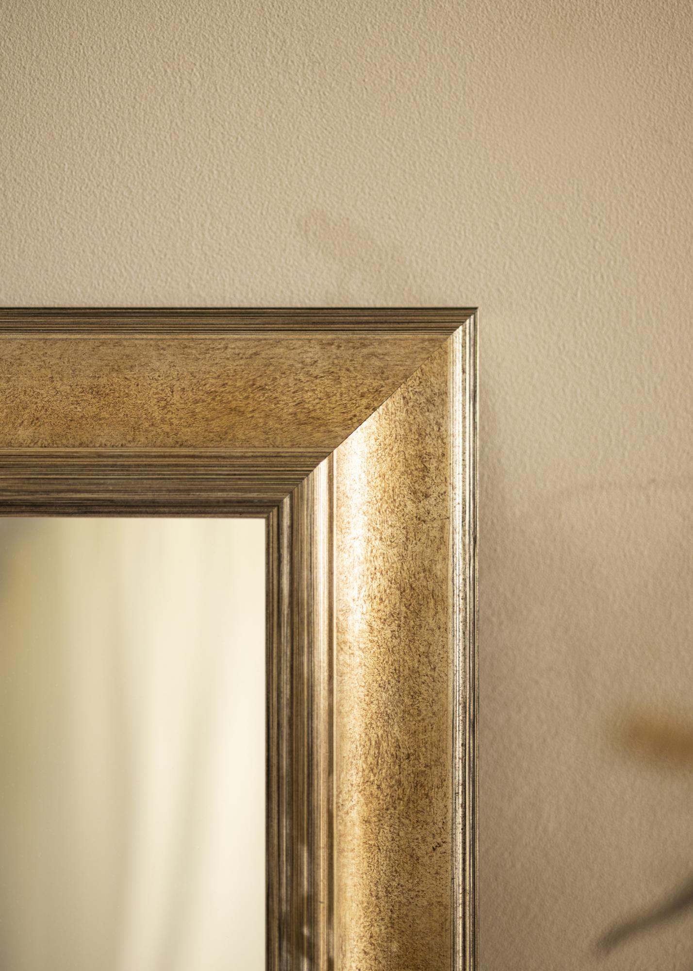 Den mørke sølvtonen på speilet gir en klassisk og tidløs følelse, noe som gjør det lett å matche med ulike interiørstiler. Den børstede overflaten har subtile fargeskiftninger som fremhever både dybde og struktur, noe som gir speilet en unik karakter. De tynne, lineære dekorasjonene langs kantene tilfører en ekstra dimensjon av eleganse og raffinement.