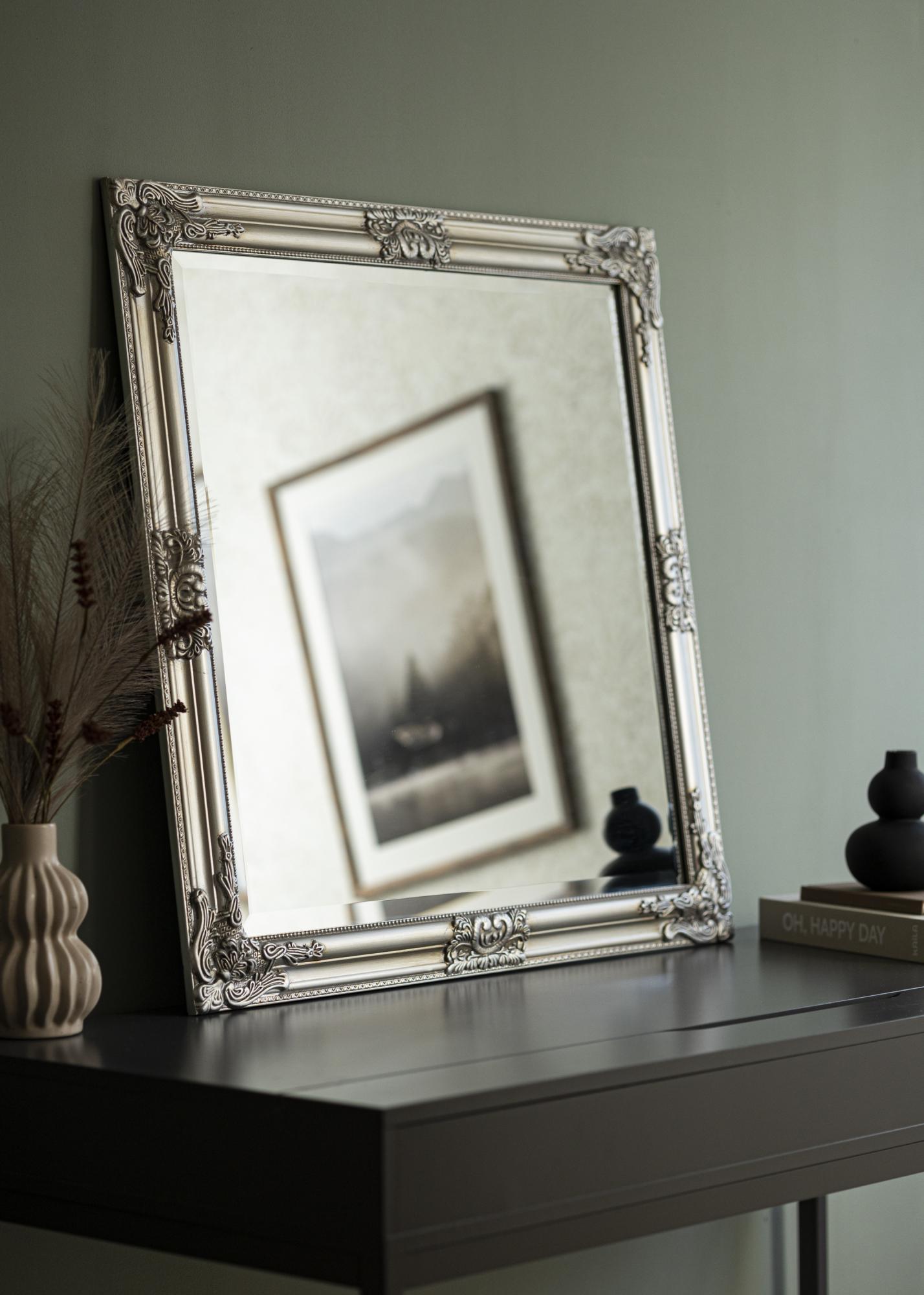 Rammen på dette speilet er et virkelig blikkfang, rik på detaljerte ornament i barokkstil som tilfører en luksuriøs og historisk følelse til rommet. Den kvadratiske formen gir en symmetrisk og balansert estetikk som komplementerer de fleste innredningsstiler. Speilrammens sølvfargede finish forsterker dens elegante uttrykk og gjør det til et allsidig element i hjemmet.