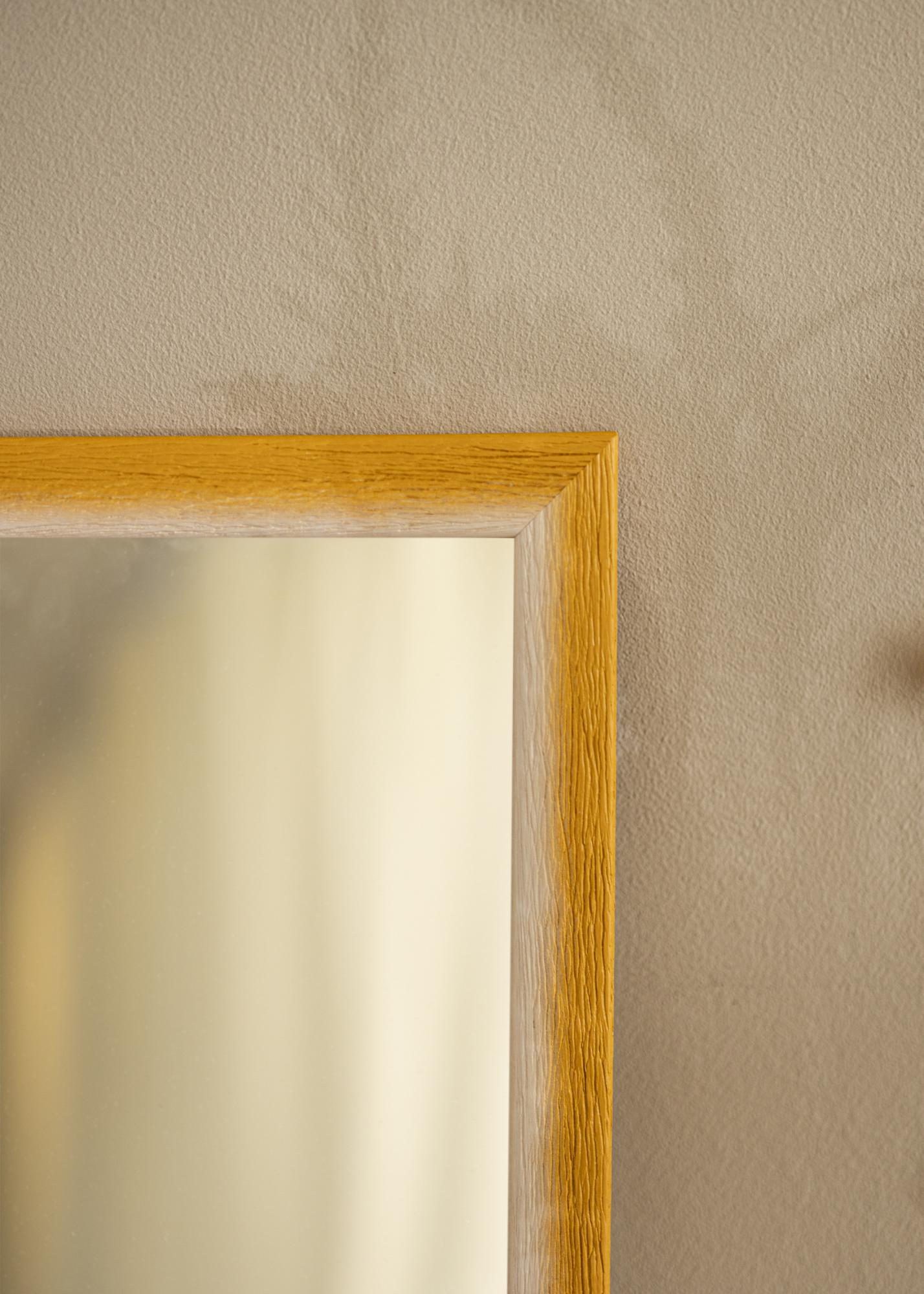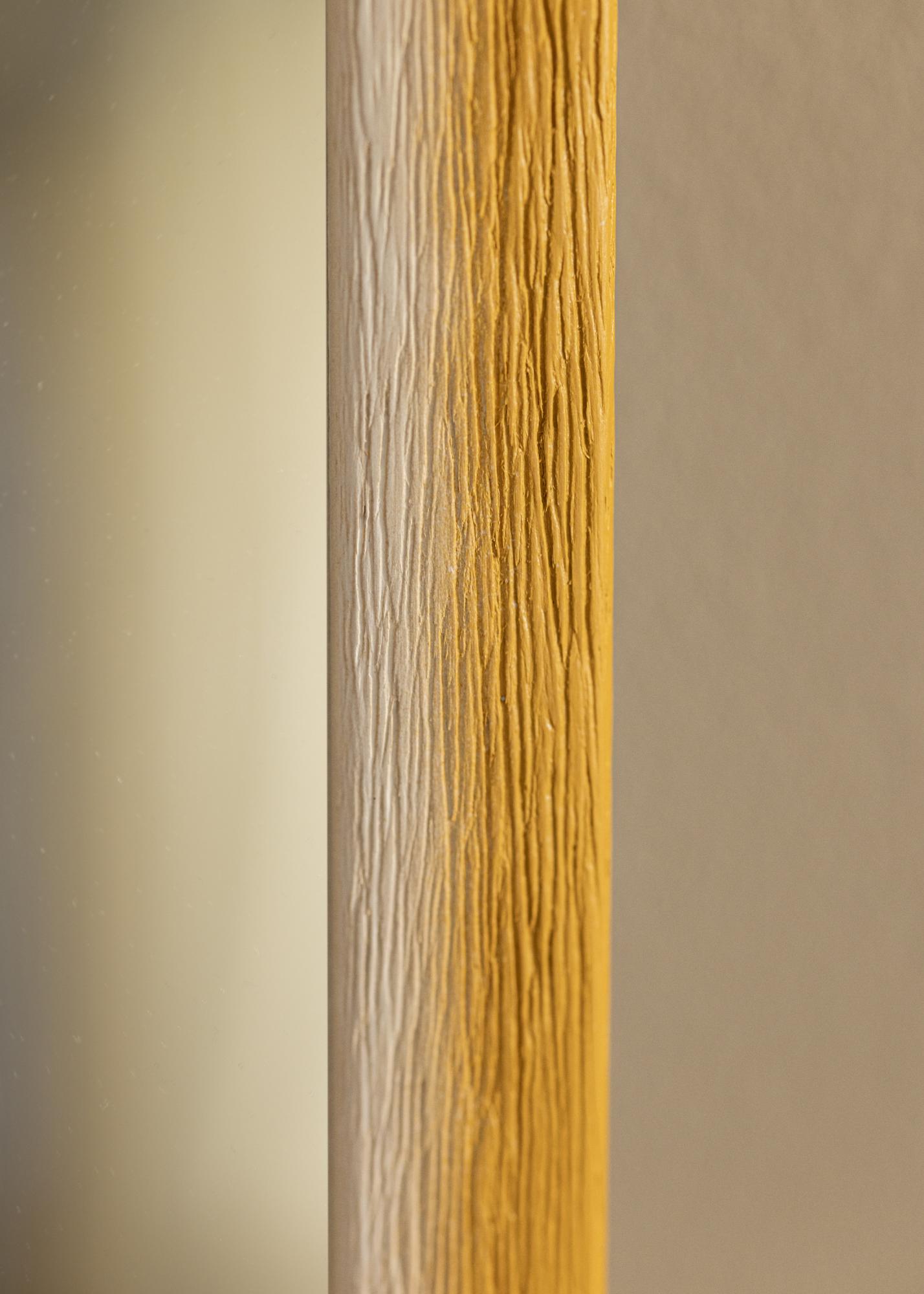 Dette speilet utmerker seg med sin harmoniske fargeovergang fra en lys, naturhvit tone til en varm okergul nyanse. Denne subtile overgangen skaper et mykt, malt uttrykk som gir rommet en levende dybde. Overflaten på rammen er preget av en tydelig trestruktur med dype årer, noe som gir en taktil og naturlig følelse. Dette gjør at speilet ikke bare er funksjonelt, men også en dekorativ detalj i ditt hjem.