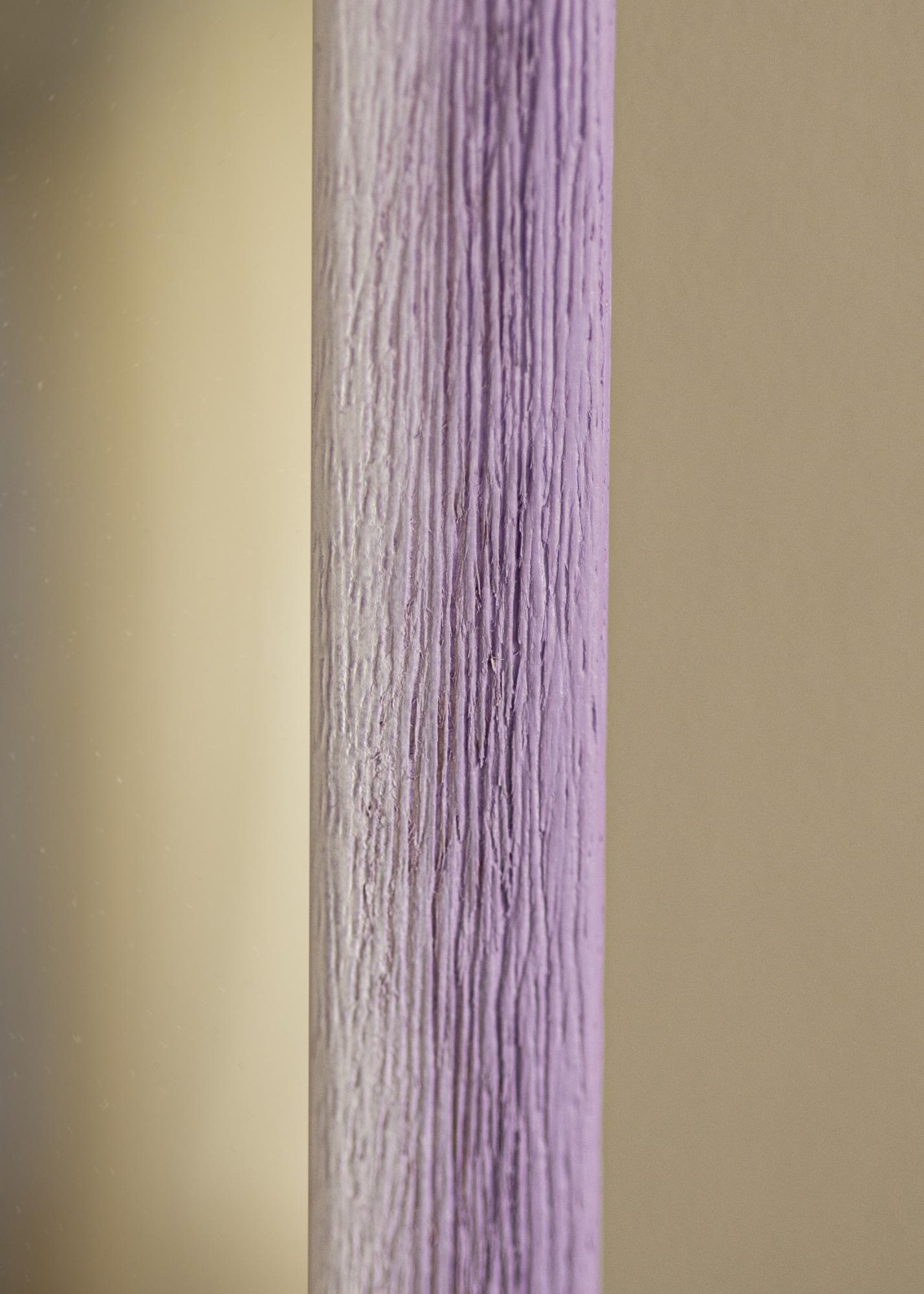 Den lyse lilla fargen på speilet har en myk overgang fra en nesten benhvit tone til en mild lavendellilla nyanse. Dette gir speilet en harmonisk og rolig følelse, noe som gjør det ideelt for å skape en avslappende atmosfære i hjemmet ditt. Den fremtredende trestrukturen med vertikale årringer bidrar til en naturlig og rustikk følelse, som gjør at speilet passer godt inn i både moderne og tradisjonelle interiører.