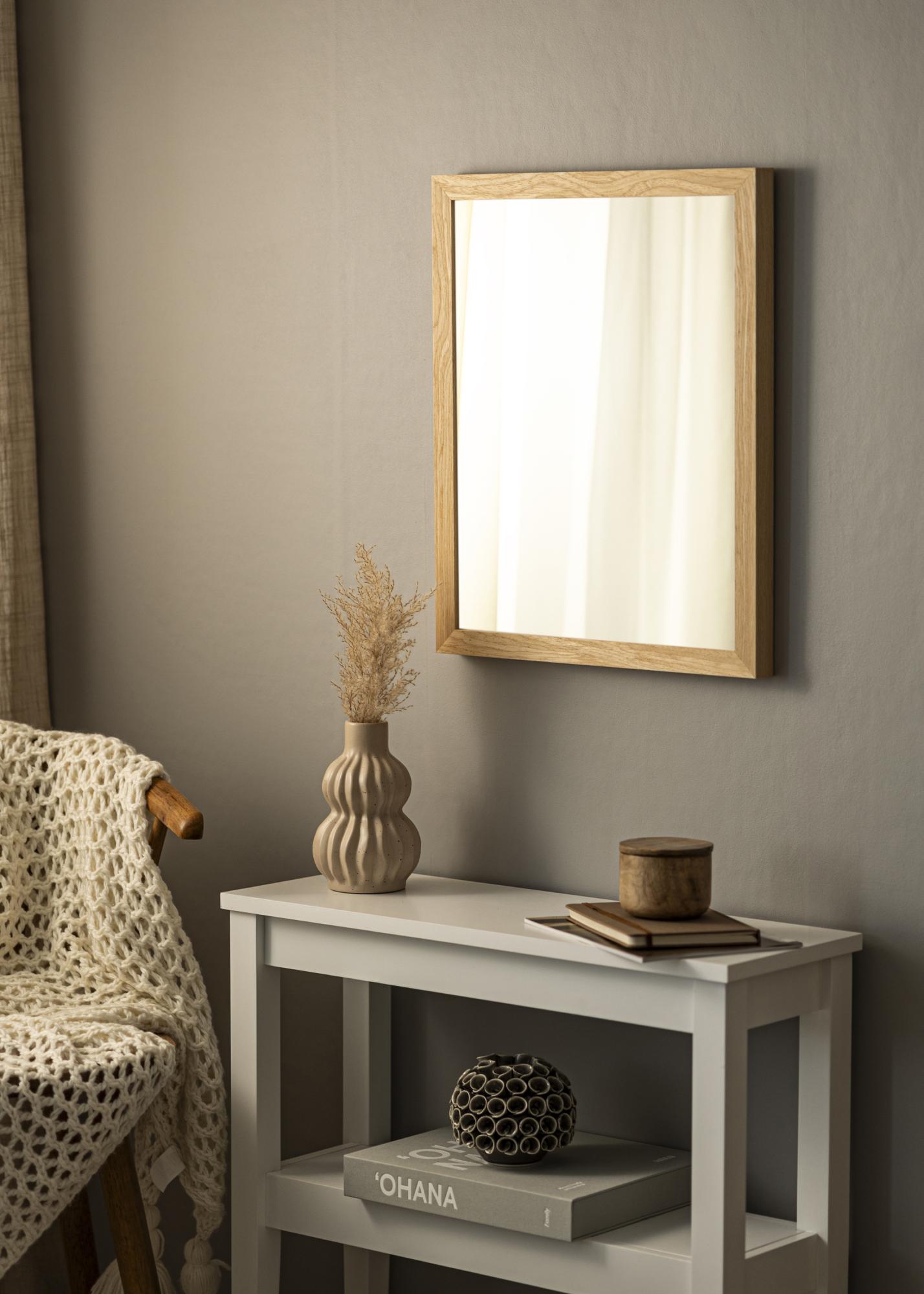Dette speilet har en elegant beige farge som smelter inn i de fleste interiørstiler. Rammen er 28 mm bred og gir speilet en stilren og moderne følelse. Med en dybde på 33 mm har speilet en robust konstruksjon som gjør det både holdbart og stabilt. Laget av furu, tilbyr det en varm og naturlig trefinish som skaper en innbydende atmosfære i hvilket rom det enn plasseres.