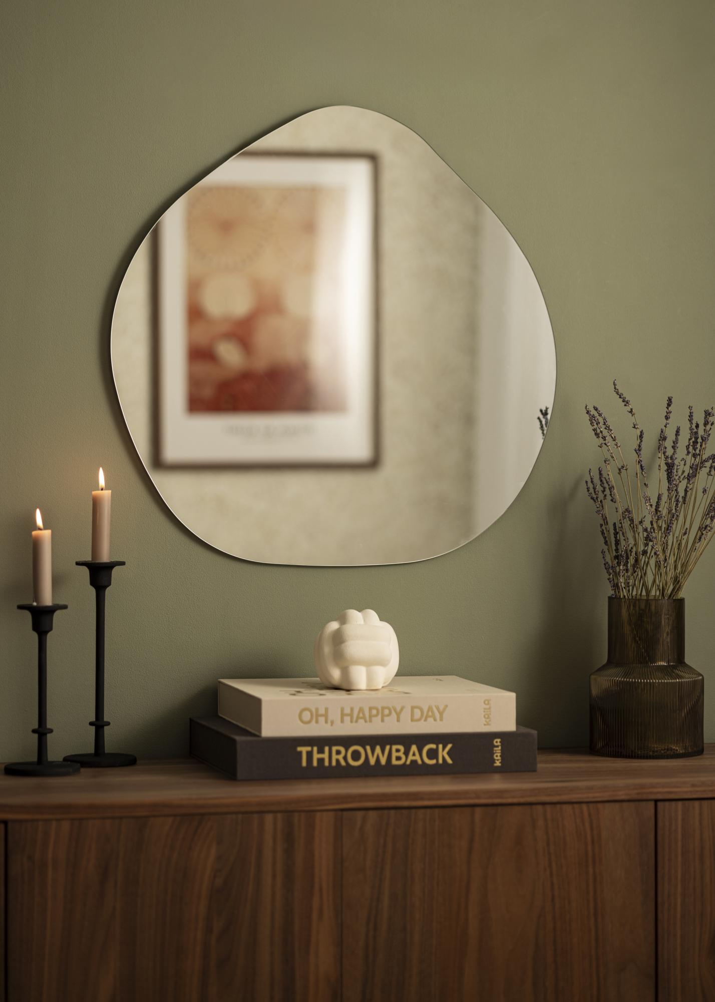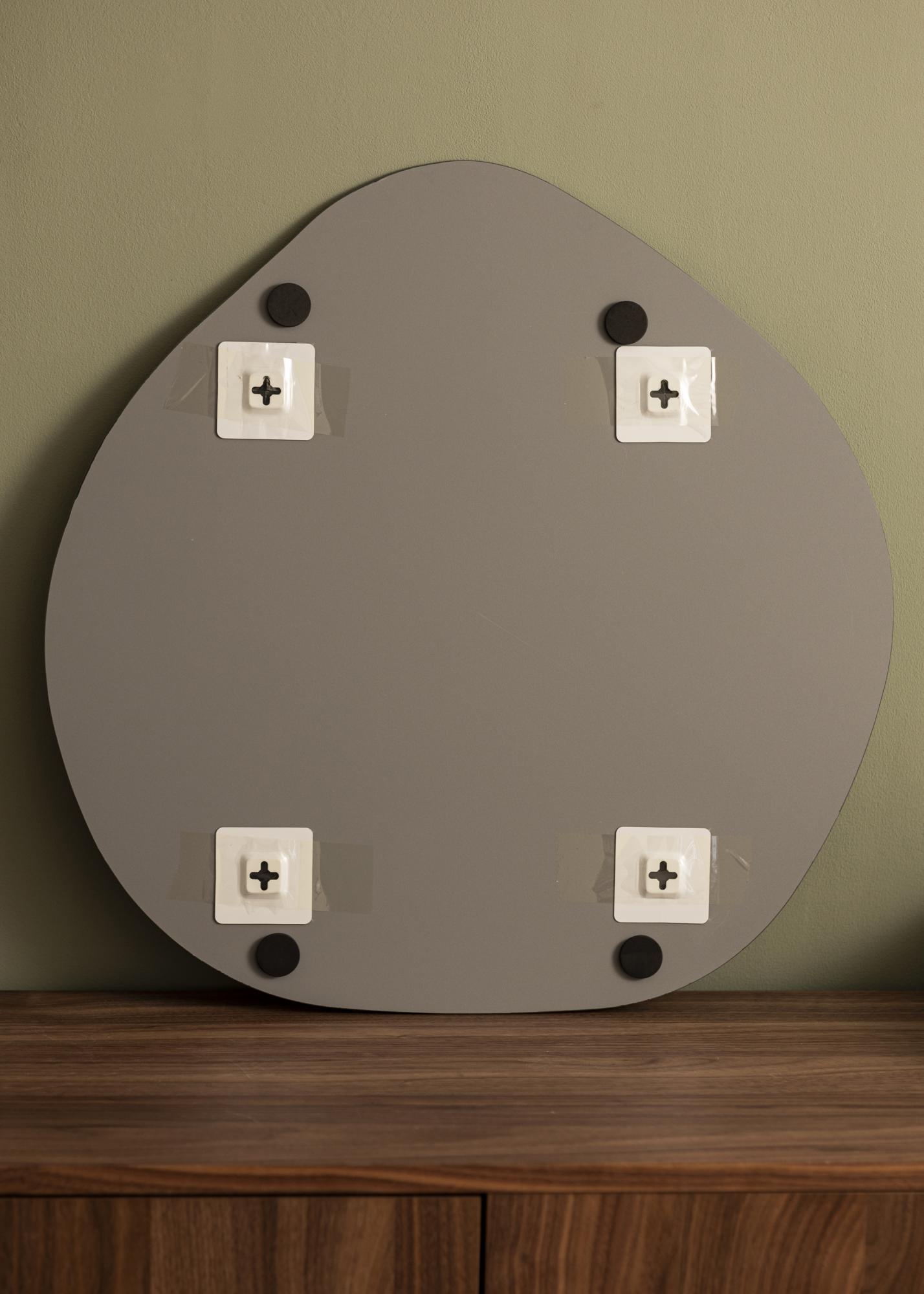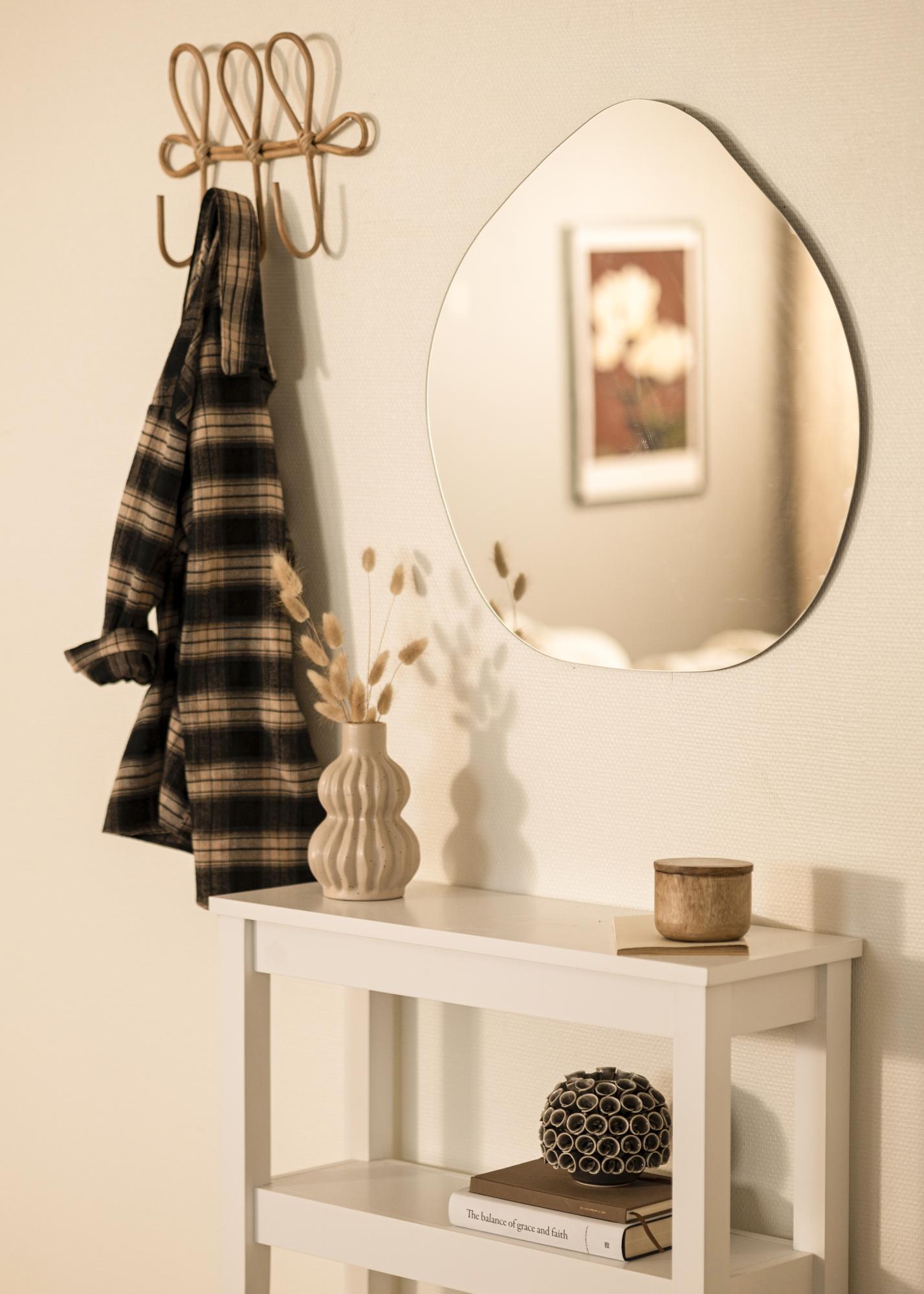 Oppdag den unike sjarmen til vår asymmetriskt formede speil, en ekte blikkfang for hvert rom. Med sine myke linjer og moderne design, tilbyr dette speilet en perfekt balanse mellom funksjonalitet og stil. Målene på 60x60 cm gjør det tilstrekkelig stort til å være praktisk, samtidig som det beholder en diskret tilstedeværelse på veggen.