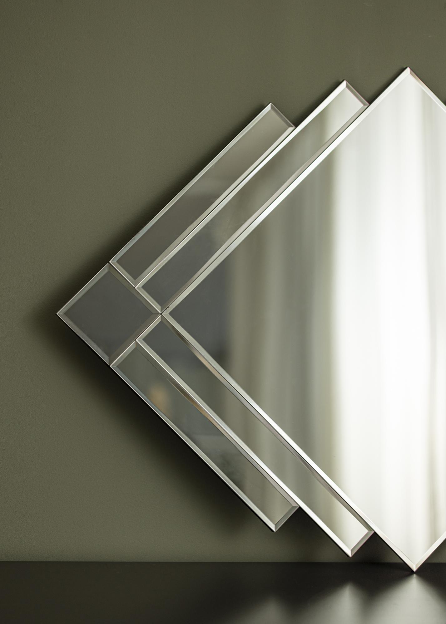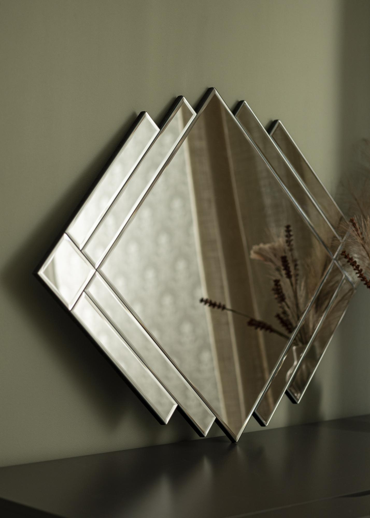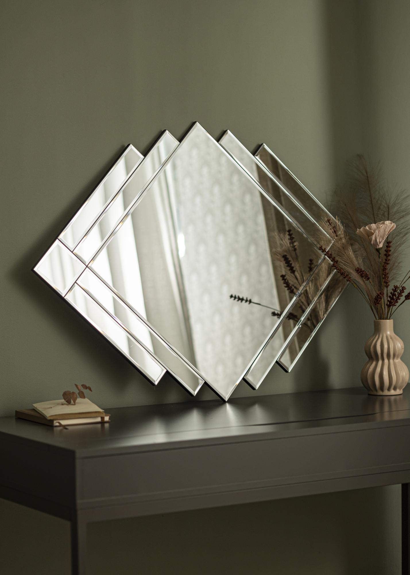 Oppdag et speil som bryter normen og tilfører en kunstnerisk touch til hjemmet ditt. Med sine mangefasetterte speildeler, tilbyr dette speilet en uvanlig og iøynefallende form som garantert blir et samtaleemne. Størrelsen på 71x99 cm gjør det til et praktfullt blikkfang uansett hvor det plasseres.