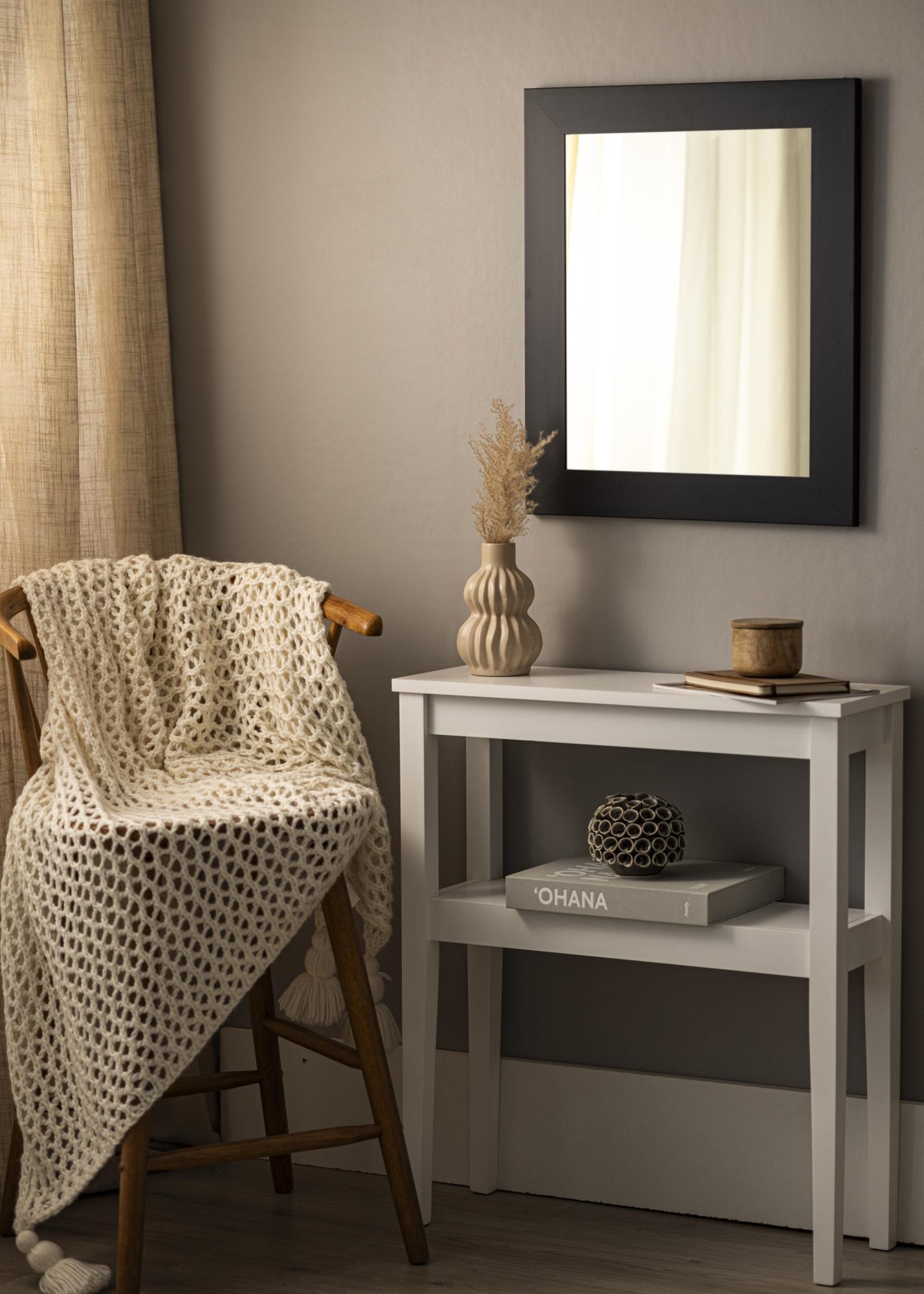 Dette speilet har en elegant svart farge som gir et moderne og stilrent inntrykk. Den 69 mm brede ramlisten i matt svart Ayos-tre bidrar til speilets sofistikerte utseende og gjør den til et utmerket komplement til både klassiske og moderne interiørstiler. Med en dybde på 22 mm har speilet en robust konstruksjon som sikrer dens holdbarhet og stabilitet.